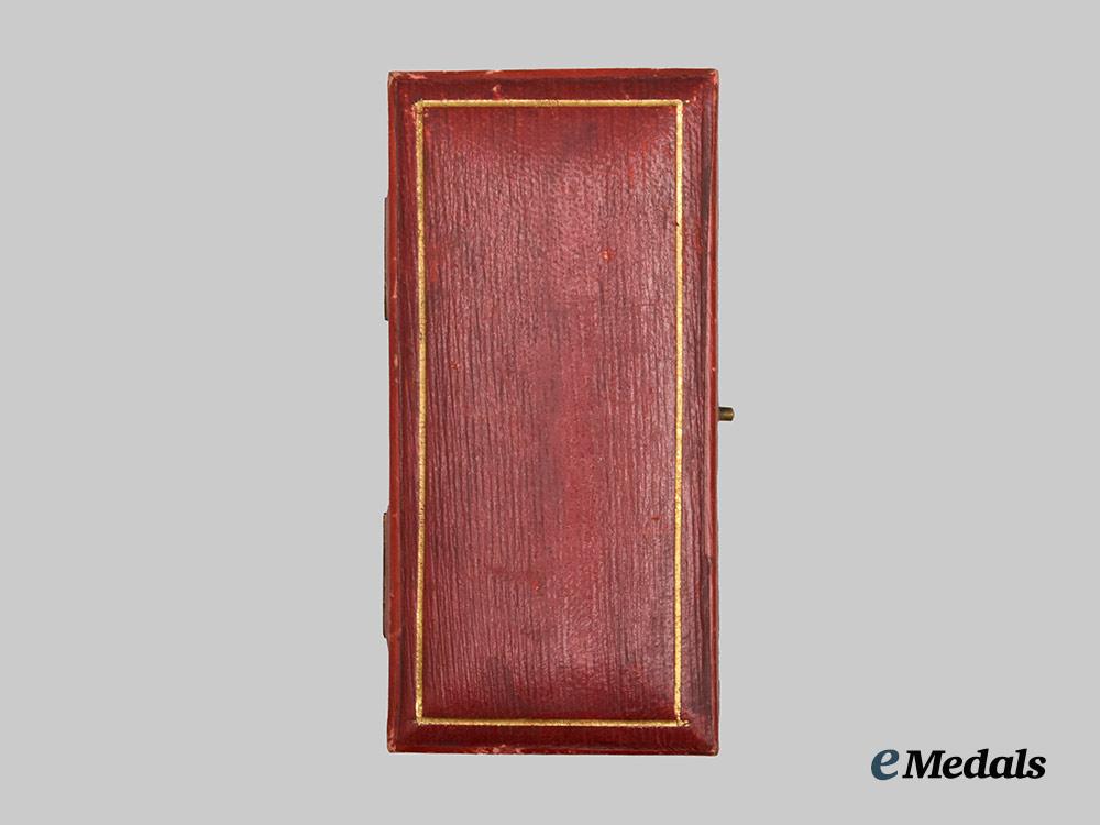 Contained in a russian case, red leatherette exterior with an interior black velvet medal bed and silk lid, measures 118.5 mm (w) x 58 mm (h) x 20.8mm (d), light wear to exterior, hinge and clasp functional, in very fine condition.