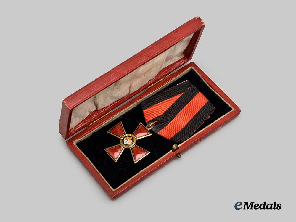 (Орден Святого Владимира, 4-я степень). Instituted 3 October 1782 (22 September O.S.) by Empress Catherine II. Constructed of gilded bronze with multi-coloured enamels, consisting of a Cross Pattée with red enameled arms trimmed with black enamelled borders, the obverse bearing a central black enamelled medallion overlaid by a hand-painted ermine mantle, topped by a crown presenting a monogram of Saint Vladimir, situated within a gilded ring, the reverse bearing a central black enameled medallion bearing a gilt instituted date of “22 СЕНТЯБРЯ 1782” (“22 SEPTEMBER 1782”), the reverse six o’clock arm bearing a K hallmark above a Dimitry Osipov maker mark (ДО), measuring 34.36 mm (w) x 38.48 mm (h), worn on a five sided ribbon suspension, demonstrating minor scratching and flecking throughout the enamels in addition to sporadic loss of gilt finish to the frame, a wartime example in near extremely fine condition.