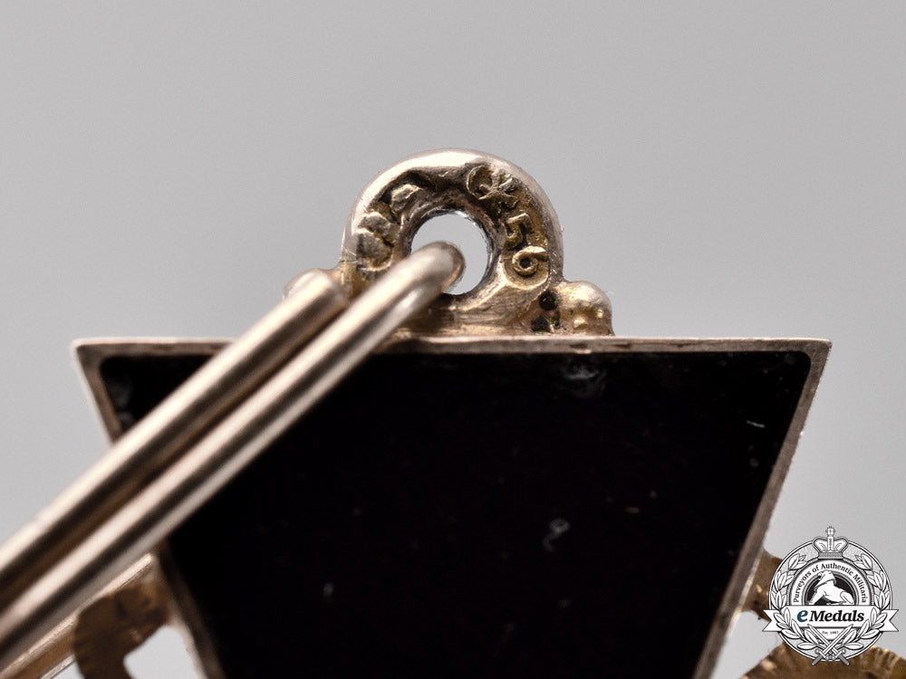 (Орден Святой Анны). Instituted 1735. Civil Division. Of superb quality and craftsmanship, typical of the period, in 18k Gold consisting of four near black enameled arms within Gold framing, ornate design in Gold in each quadrant, obverse centre applique a hand painted St.Anne (Anna Petrovna, daughter of Peter the Great of Russia), reverse centre blue hand painted initials "A.I.P.F." (for "Anna Imperatoris Petri Filia": "Anna, Emperor Peter's daughter" in Latin) on white enamel, integral ring Gold hallmarked 56 and city marked for St. Petersburg (1873-1898), industry unidentified makers marked, measuring 38.8 mm (w) x 42.4 mm (h - inclusive of integral ring), 11.00 grams, on short section of period ribbon, with light area on reverse 3 o'clock arm, extremely fine.