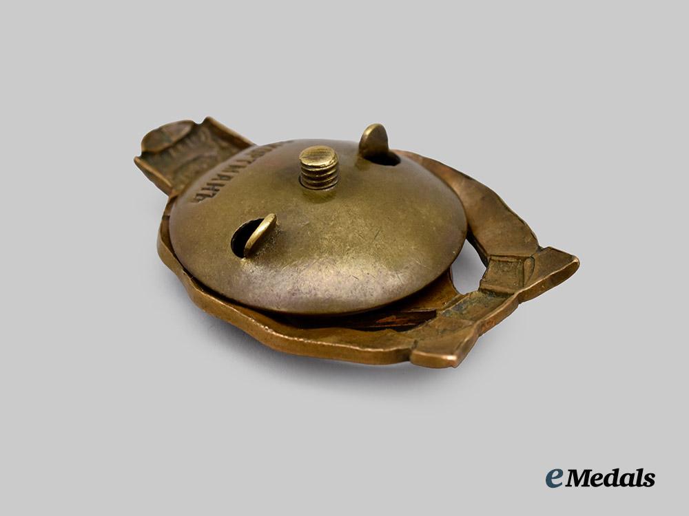 Constructed of bronze with multi-coloured enamels, the obverse consisting of an oval and blue enameled ribbon wreath, topped by a cossack papakha, surrounding a central shield bearing a double-headed Russian imperial eagle overlaid by a blue enameled bar (signifying the Ural River) and clutching a St. Andrew’s Cross, situated above a bow superimposed by crossed arrows, the reverse with a central threaded screwpost retaining an original backplate, the latter bearing a maker’s mark of “"З. КОРТМАНЪ" for the firm of Eduard Kortman, measuring 35.87 mm (w) x 54.32 mm (h), weighing 26.2 grams, demonstrating chipping throughout the enamels, a scarce example in very fine condition.