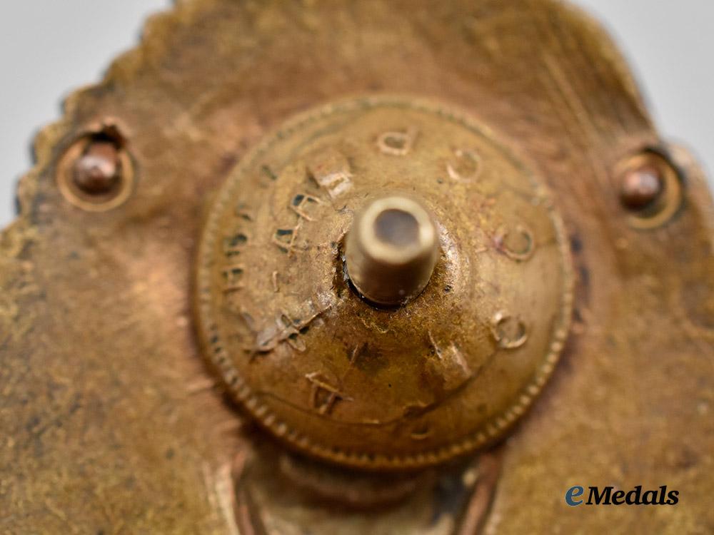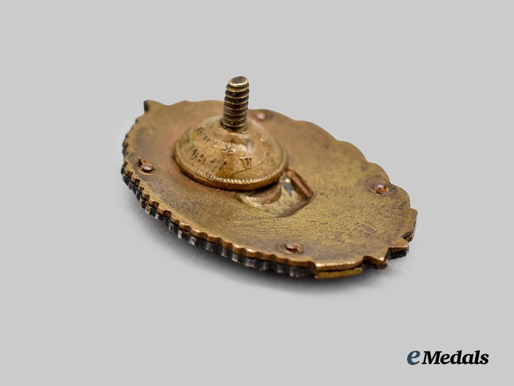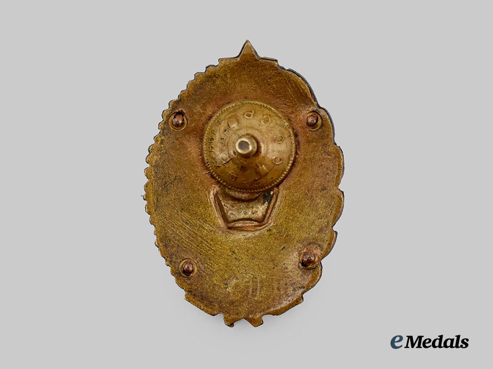Constructed of silvered bronze with multi-coloured enamels, the obverse consisting of an oval laurel and oak leaf wreath, joined together at the bottom by a blue enameled banner bearing gilt initials “МВТУ” (Московским высшим техническим училищем, or Moscow Higher Technical School), surrounding a silvered and blue enameled field overlaid by a crossed hammer and wrench defaced by a Soviet coat of arms, the reverse with four visible rivets securing the obverse features in position, with a threaded screw post retaining an original factory-marked nut, measuring 26 mm (w) x 40 mm (h), in extremely fine condition.