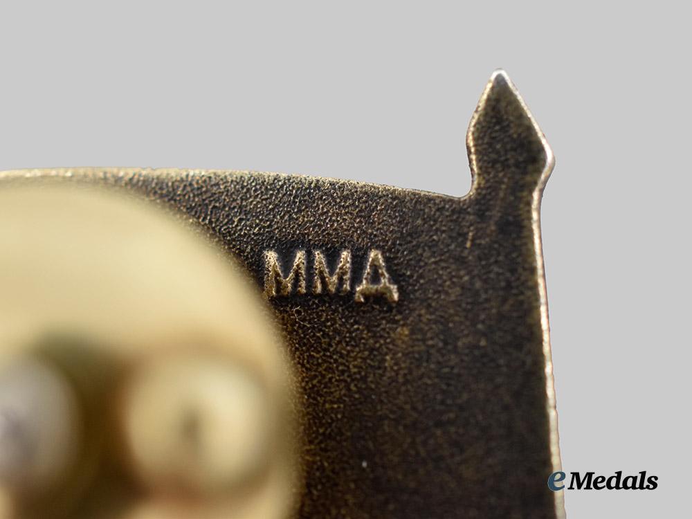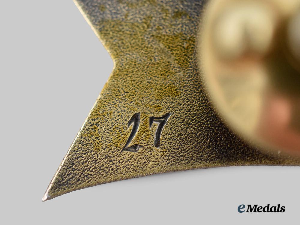 (c. 1955-1963 issue). Constructed of silvered bronze in the shape of a flag with red and blue enamels, the reverse with a threaded screw back consisting of a post and backing plate, marked by the Moscow Mint and numbered “27”, measuring 31.6 mm (w) x 25.0 mm (l), a scarce badge in extremely fine condition.