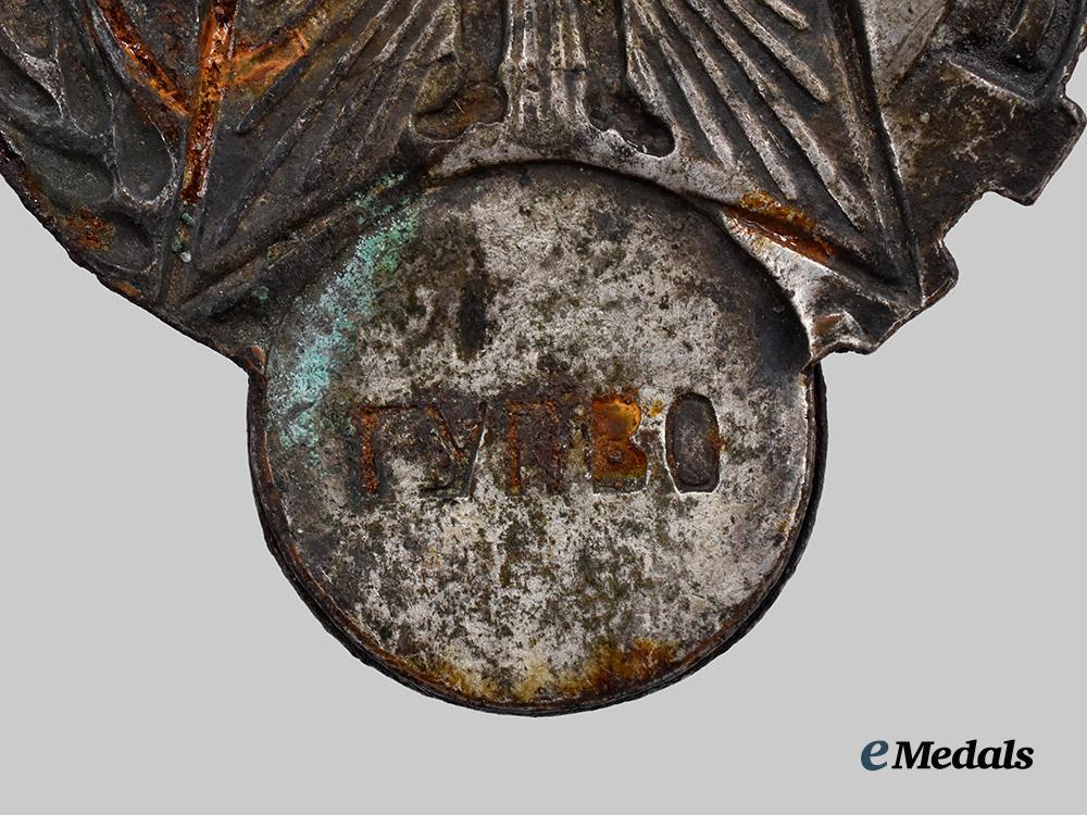(Ворошиловский стрелок). Instituted in 1932. Constructed of bronzed magnetic metal, the obverse with a central red-enameled 5-pointed Soviet star with a sharpshooter superimposed on the badge, with a red enameled banner on a circular badge inscribed with “PKKA”, the reverse with a threaded post and backing plate, marked with the maker mark of the Moscow Mint, measuring 53.2 mm (w) x 45.5 mm (l), a scarce badge in fine condition.