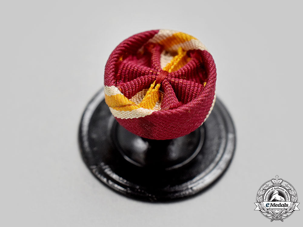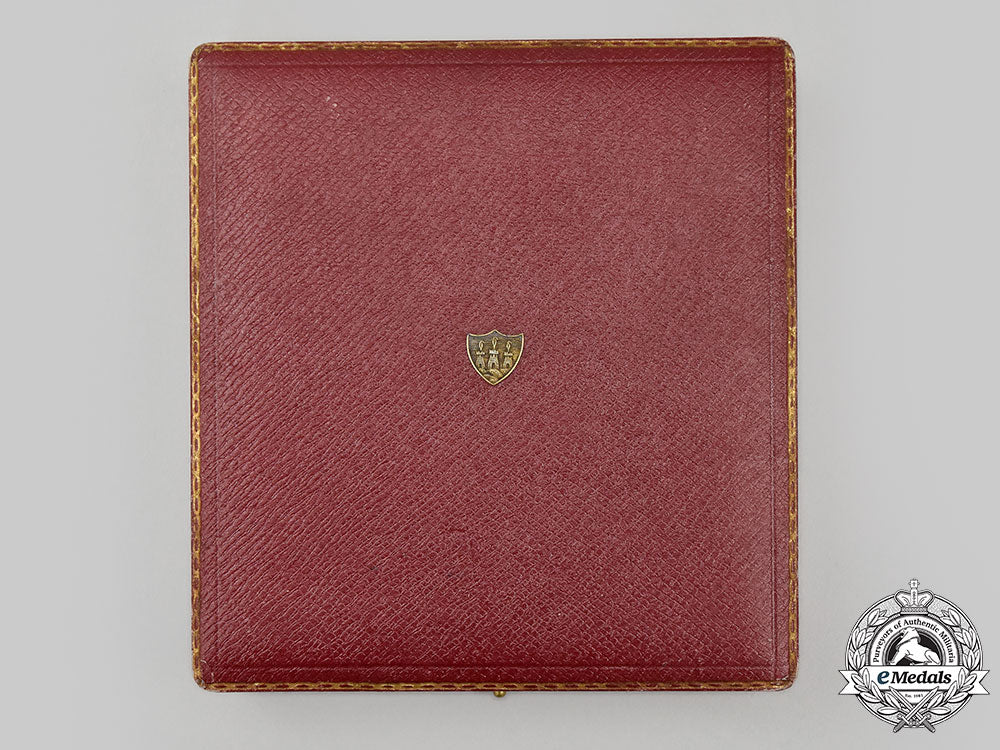 (Ordine Equestre di Saint' Agata). Instituted in 1923. Multi-piece construction, in bronze gilt with white, red and green enamels, handpainted centrepiece on the obverse, measuring 53.7 mm (w) x 59.7 mm (h) inclusive of its integral ring, intact enamels, on its original full-length neck ribbon; and Miniature: in bronze gilt with white and green enamels, handpainted centrepiece on the obverse, measuring 16 mm (w) x 19.2 mm (h) inclusive of its integral suspension, intact enamels, original ribbon. Together, extremely fine. Accompanied by its Rosette, measuring 10.5 mm in diameter with button hole attachment, in their hardshelled case of issue, maroon thatch-textured exterior, bronze shield bearing the Republic of San Marino coat-of-arms affixed to the lid, inside lid in white satin and padded, insert placed in the base with the medal bed in maroon felt with recessed areas to house the badge, miniature and rosette, measuring 134 mm (w) x 149 mm (h) x 26 mm (d), with light wear on all the edges and corners on the exterior, case better than very fine.