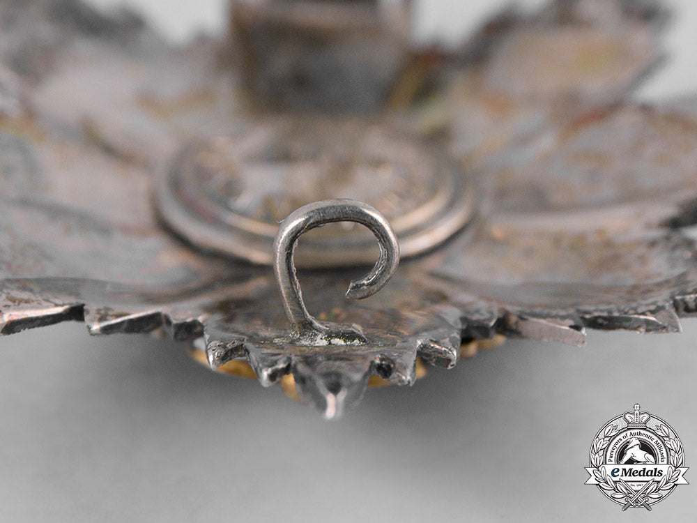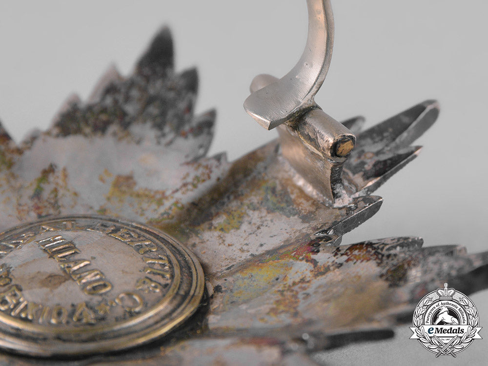 (Ordine Equestre Civile e Militaire di San Marino). Instituted in 1859. Insignia in silver gilt with blue, white, red and green enamels, mounted to an eight-pointed star base, each star point with five faceted rays, maker marked "ALBERTI & C. Via No. Bixio 4 MILANO" on the reverse cartouche, measuring 72.2 mm (w) x 74.3 mm (h), vertical pinback, crazing evident in the white enamels on the arm of the cross at 6 o'clock, otherwise the enamels are intact, the insignia sitting loose versus the star base, near extremely fine.