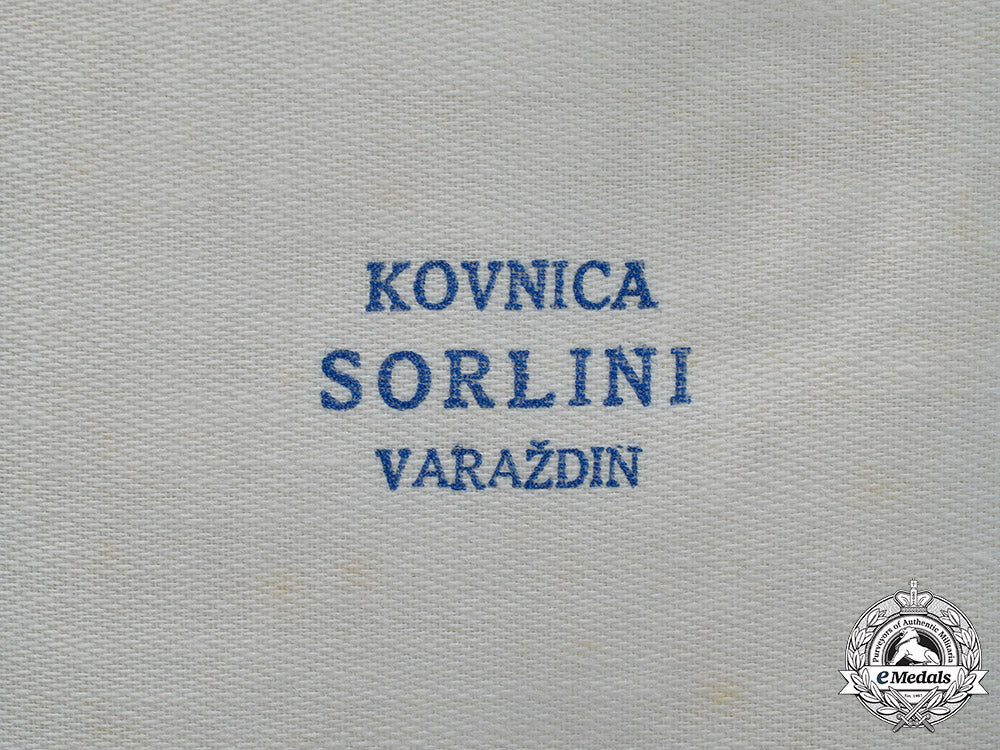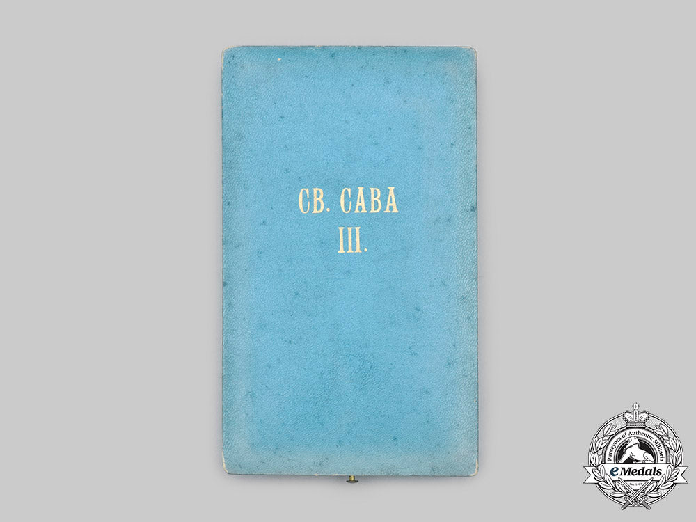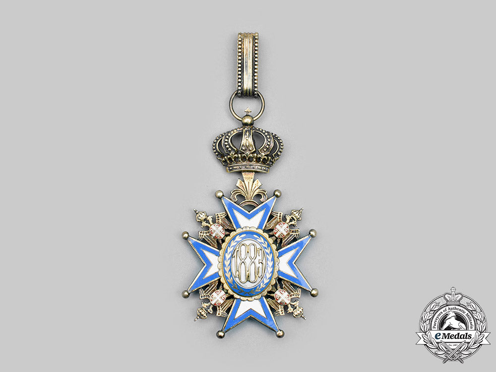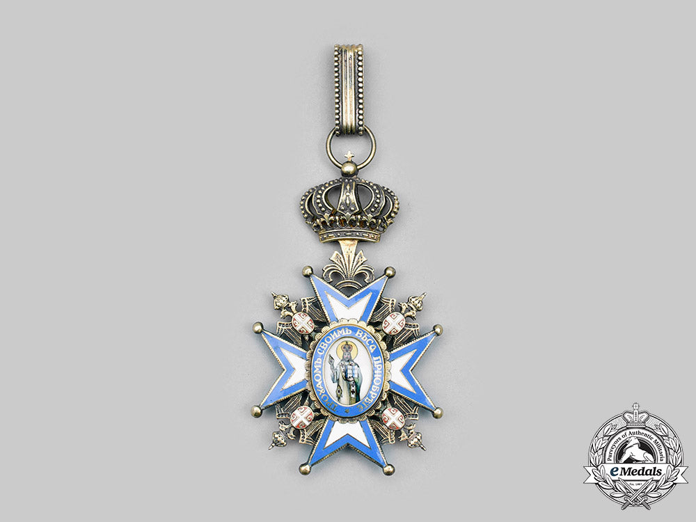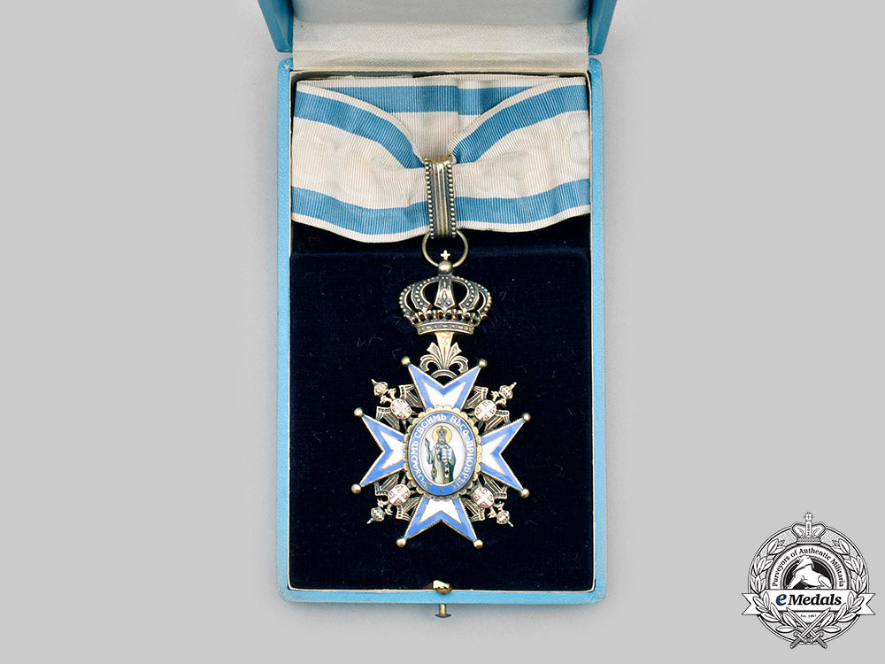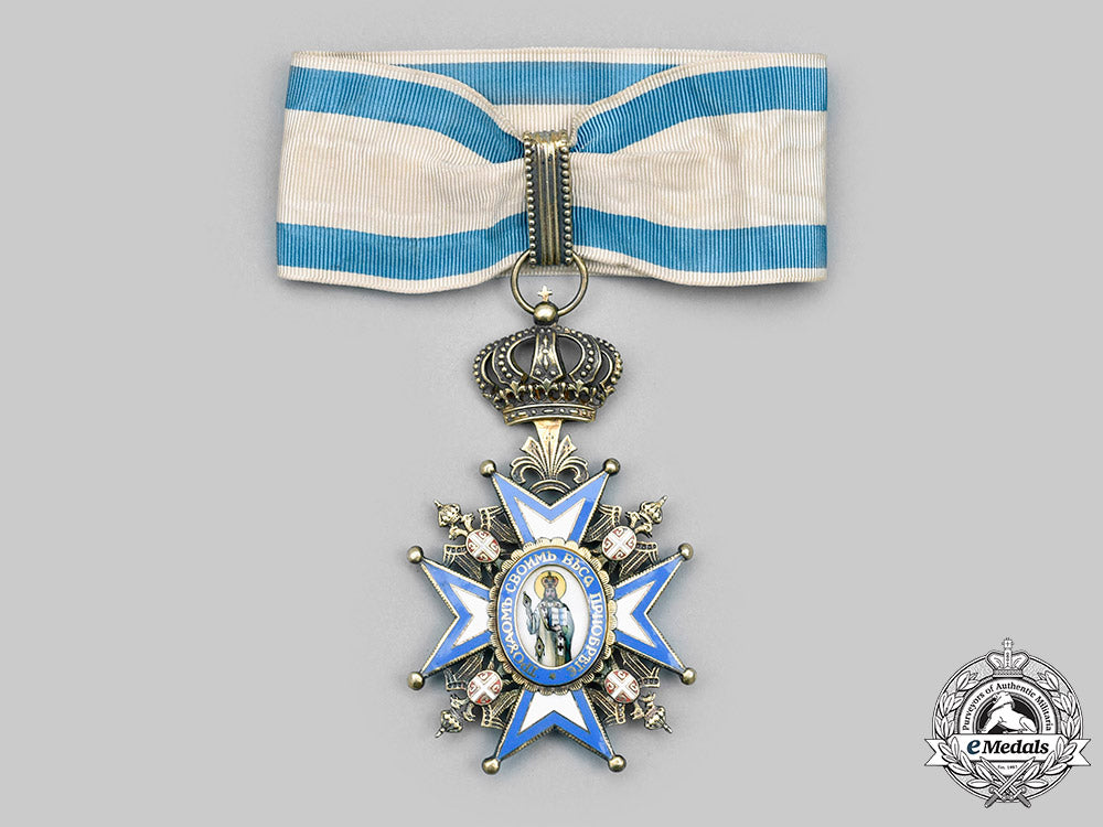 (Orden Svetog Save). Instituted in 1883. II Model, II Pattern (1921-1941). Saint in Green Robes. Multi-piece construction, in silver gilt with blue, white and red enamels, image of the Saint in Green Robes on the central white enamelled oval disk, dated "1883" on the reverse, unmarked, measuring 51 mm (w) x 86.5 mm (h) inclusive of its crown suspension, original neck ribbon, the obverse with fine chipping evident in blue enamels on the arm at 9 o'clock, near extremely fine. In its hardshelled case of issue, wooden-framed, marked "CB. CABA III." (St. Sava 3rd Class) on the lid, maker marked in Croatian "KOVNICA SORLINI VARAŽDIN" (Sorlini Mint in Varaždin) on the white cloth inside lid, raised platform with a navy blue felt recessed medal bed, dual-hinged, measuring 93 mm (w) x 160 mm (d) x 33.5 mm (h), light wear, spotting and sunning evident on the exterior, case fine.