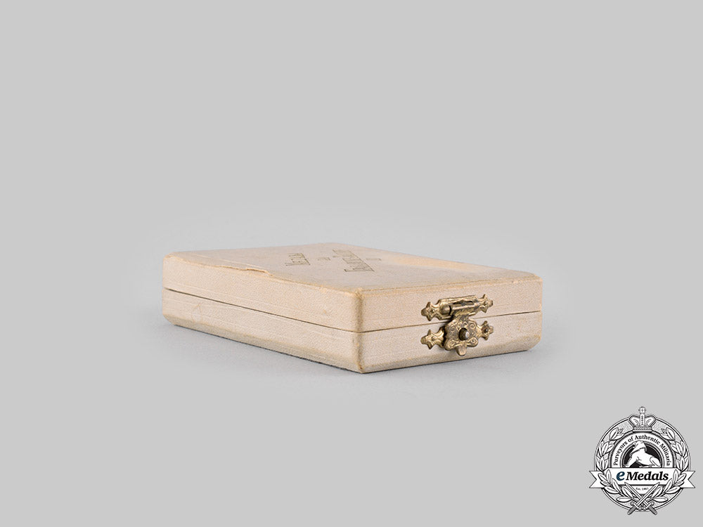 (Medalja za gradanske zasluge). Instituted in 1902. Hardshelled design on both the lid and base, the exterior with a white dimpled paper covering on five sides, the bottom with a pebbled black paper covering, the lid bearing the inscription "МЕДАЉА ЗА ГРАЂАНСКЕ ЗАСЛУГЕ II" in gold-coloured ink, inside lid lined in white satin, padded and maker marked "HUGUENIN FRÈRES & Co Médailleurs LE LOCLE (Suisse)" in French and Serbian, white fabric-wrapped cardboard insert placed within the base and incorporating a recessed medal bed in black felt, paper-hinged, latch closure, measuring 68 mm in width x 101.5 mm in height x 23 mm in depth, light wear and soiling evident on the exterior, very fine.