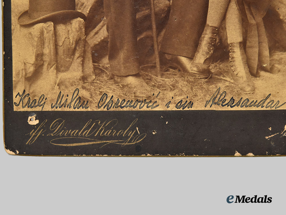 (Photograph). A photograph of King Milan Obrenović I of Serbia with his son and future King Alexander I, mounted on a cardstock backer, with writing in black pen on the obverse near the bottom of the picture reading “Kralj Milan Obrenović” and “Aleksandar”, the carstock maker marked on the buttom as well as on the reverse, measuring 134 mm (w) x 204 mm (l), signs present of having been previously mounted, in overall very fine condition.