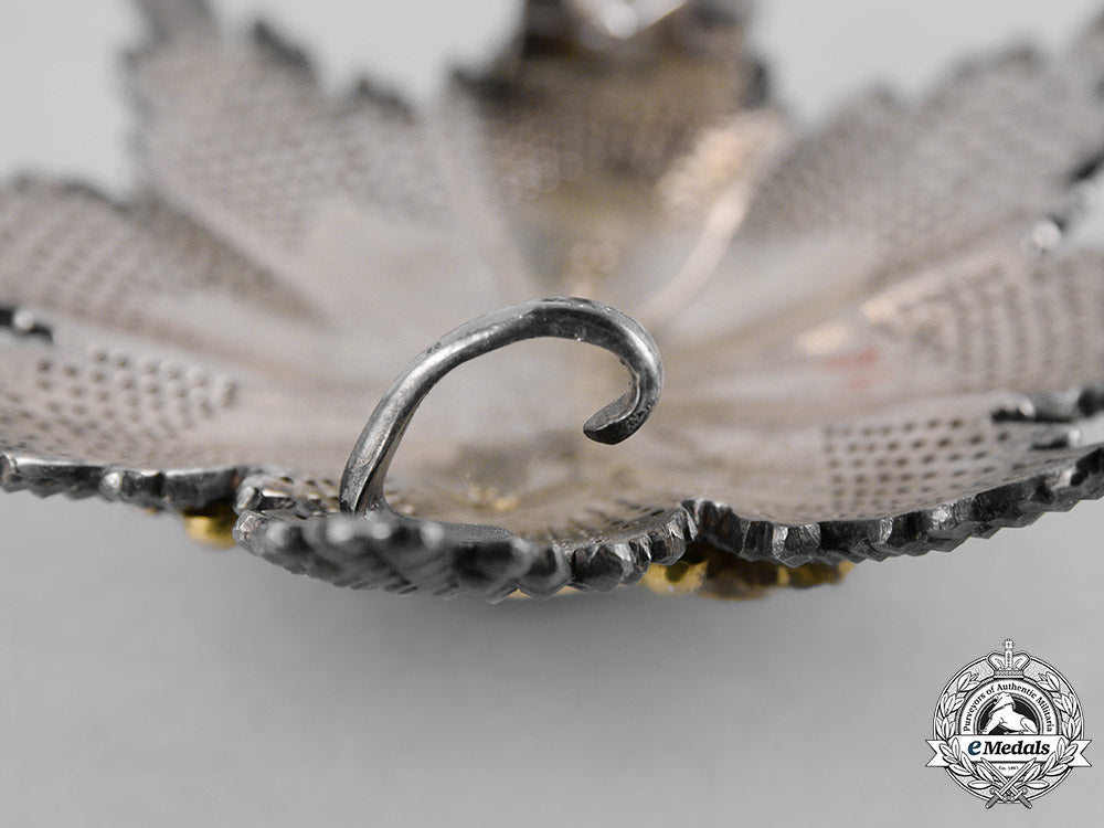 (Orden Svetog Save). Instituted 23 January 1883 by Milan I. (1921-1941 issue). Constructed of gilded silver with multi-coloured enamels, consisting of a pebbled eight-pointed radiant star, the obverse overlaid by a gilt Maltese Cross with ball finials, the quadrants joined by double-headed eagles overlaid by Serbian coats of arms, with a central white enameled medallion bearing a hand-painted depiction of Saint Sava, surrounded by a blue enameled ring bearing a gilt Serbian Cyrillic inscription translating to “BY HIS TALENTS HE ACQUIRED ALL”, the reverse with a barrel hinge and banjo-style pinback meeting a round wire catch, with two visible rivets holding the obverse adornment in place, unmarked but with the physical characteristics of manufacture by Fran Sorlini, Varaždin, measuring 78.13 mm (w) x 81.40 mm (h), weighing 63.0 grams, minor tarnishing of the silver and flecking of the enamels evident, in extremely fine condition.