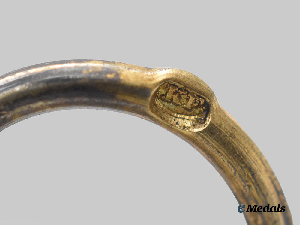 (Orden Svetog Save). Instituted in 1883. Type I (1883-1903). Maltese cross in blue and white enamel, each of the arms finished with two ball finials, Serbian double-eagles with shields in each corner, obverse oval centerpiece shows distinctive iconography of St. Sava, surrounded by inscription in blue enamel, reverse oval centerpiece shows Royal cypher of Milan I within blue enameled outer circlet decorated with golden laurel wreath, suspension ring marked KF (denoting the maker Karl Fischmeister) and a lion with A 4 (for very small items of .750 purity, made in Austria), inclusive of crown suspension 63.1 mm (h) x 39.5 mm (w), on ribbon, extremely fine condition.