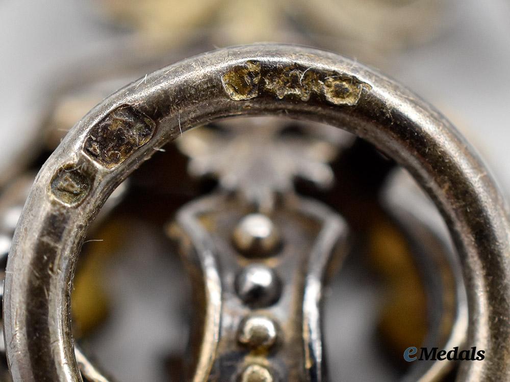 (Orden Svetog Save). Instituted January 23rd, 1883. Type II (1903-1921 issue, c. 1905). A fine Austrian-made Order of St. Sava IV. Class Officer, constructed of gilded silver, consisting of a Maltese cross with ball finials, the arms of the cross in light blue and white enamels and with Serbian double-eagles with shields on their chests in the quadrants between the arms of the cross, the obverse with a central white enameled medallion bearing a delicately hand-painted depiction of St. Sava wearing green robes, surrounded by a matching inscription in gilt within blue enamels, the reverse with a similar central white enameled medallion inscribed “1883” in raised silver gilt numbers within a blue enameled outer circlet decorated with gilded laurels, suspended from a hollow swivel crown as well as a pierced ball and swivel round loop from its shortened period original ribbon, marked “G.A.S” on the swivel ring for manufacture by Scheid of Vienna, with silver hallmarks on the swivel ring but undecipherable, measuring 42.0 mm (w) x 66.7 mm (l), weighing 23.56 grams, a fine quality example with light contact marks to the enamels but an overall very well preserved example, in overall better than very fine condition.