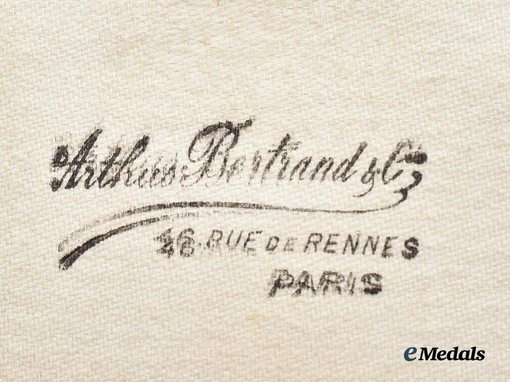 Accompanied by a presentation case, constructed of a lightweight wooden core with a dark blue, lightly textured, faux leather exterior, the exterior of the lid embossed with the seal of the award in gilt, with an intact and functional paper hinge, with a moderately frayed interior fabric hinge cover, and functional exterior metal push-button closure, the interior of the lid marked “Arthus Bertrand, Paris”, with a mismatched black fabric recessed medal bed for comfortable seating of the award, measuring 67 mm (w) x 122 mm (l), in near extremely fine condition.