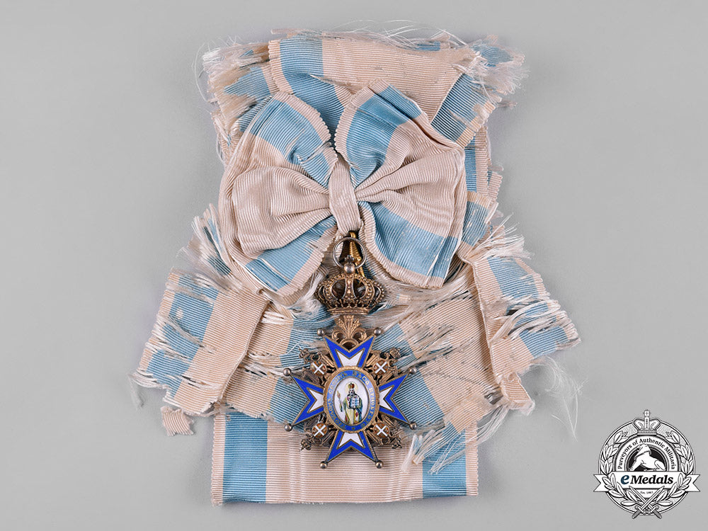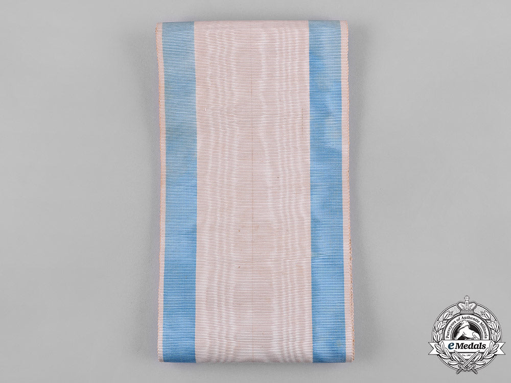 (Orden Svetog Save). Instituted in 1883. II Model, II Pattern (1921-1941). Saint in Green Robes. In silver gilt with blue, white and red enamels, gilt centre piece rings, painted obverse centre piece, measuring 52 mm (w) x 85 mm (h) inclusive of its crown and laterally-pierced ball suspension, chipping and repair evident in the blue and white enamels on the obverse centrepiece, accompanied by its original extensively frayed full-length sash incorporating a decorative moiré pattern, along with a full-length original sash also with a decorative moiré pattern and one small soiling spot, better than very fine.