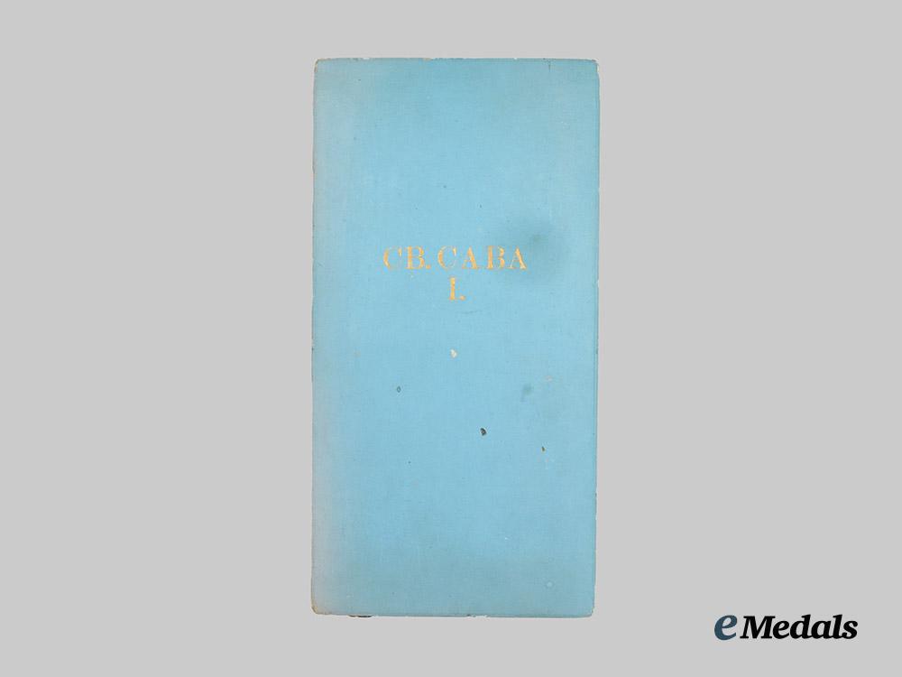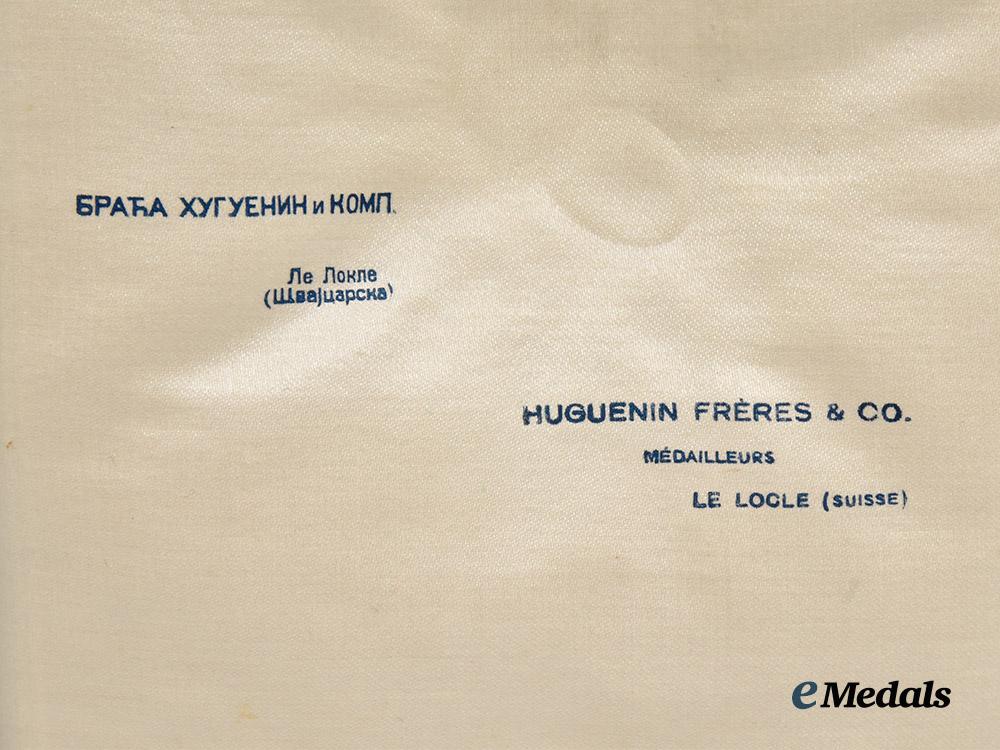 (Orden Svetog Save). II Model, II Pattern (1921-1941). Instituted in 1883. Saint in Green Robes. Grand Cross Badge: in silver gilt with blue, white and red enamels, gilt centrepiece rings, painted obverse centrepiece, dated "1883" on the reverse, measuring 52 mm (w) x 85 mm (h) inclusive of its crown and laterally-pierced ball suspension, intact enamels, on its full-length original sash that incorporates a decorative moiré pattern and features a large rosette fronting a bow-tie; and Grand Cross Breast Star: multi-piece construction, unmarked, 49.5 mm (w) x 52 mm (h) insignia in silver gilt with blue, white and red enamels, image of the Saint in Green Robes on the central white enamelled oval disk, mounted to an eight-pointed silver star base, each star point with five dual-faceted rays, measuring 83.5 mm (w) x 89.5 mm (h), vertical pinback, very light crazing in the white enamels on the arm at 6 o'clock. Together, extremely fine. In their hardshelled case of issue, wooden-framed, marked "CB. CABA I." (St. Sava I Class) on the lid, maker marked "HUGUENIN FRERES & CO. MEDAILLEURS LE LOCLE (SUISSE)" in French and Cyrillic on the white satin inside lid, raised platform with a navy blue velvet recessed medal beds for the breast star and badge, dual-hinged, measuring 155 mm (w) x 300 mm (d) x 53 mm (h), exhibiting sunning, scuffing, spotting and soiling present on the exterior, case very fine.