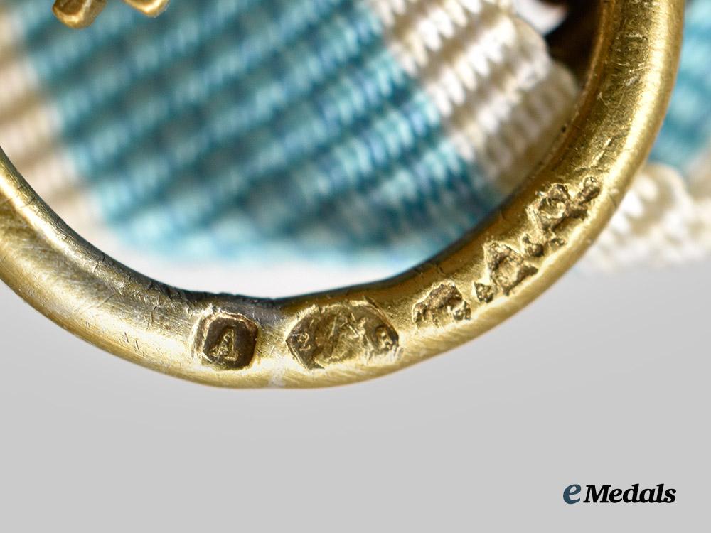 (Orden Svetog Save). Instituted January 23rd, 1883. Type II (1903-1921 issue, c. 1905). A fine Austrian-made Order of St. Sava IV. Class Officer, constructed of gilded silver, consisting of a Maltese cross with ball finials, the arms of the cross in light blue and white enamels and with Serbian double-eagles with shields on their chests in the quadrants between the arms of the cross, the obverse with a central white enamelled medallion bearing a delicately hand-painted depiction of St. Sava wearing red robes, surrounded by a matching inscription in gilt within blue enamels, the reverse with a similar central white enameled medallion inscribed “1883” in raised silver gilt numbers within a blue enameled outer circlet decorated with gilded laurels, suspended from a hollow swivel crown as well as a pierced ball and swivel round loop from a replacement trifold ribbon, marked “G.A.S” on the swivel ring for manufacture by Scheid of Vienna, with silver hallmarks, measuring 41.7 mm (w) x 66.5 mm (h), weighing 25.68 grams, a fine quality example with light contact marks to the enamels but an overall very well preserved example, in overall very fine condition.