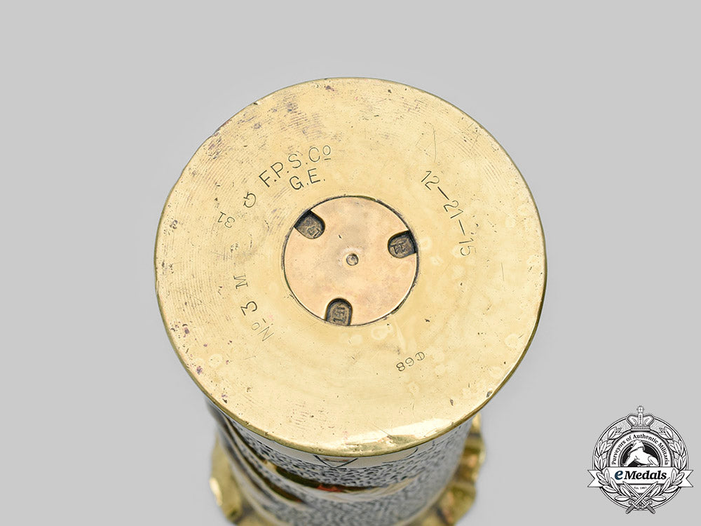 A pair of finely-detailed commemorative trench art brass shells, including one featuring a raised and wreathed Slovak Schnelle Division insignia on a dimpled background, the reverse bearing a similarly detailed skyline and coat of arms of the city of Trenčín, above a date of “1943”, the base bearing calibre unmarked, measuring 100 mm in diameter, in extremely fine condition, and; a second shell featuring a dimpled base bearing a raised Slovak Expeditionary Army Group insignia with floral designs, above an inscription of “PAMIATKA ZOVRUČA” (“IN MEMORY OF ZOVRUČA), the base bearing calibre markings, measuring 105 mm (w) x 260 mm (h), in extremely fine condition.
