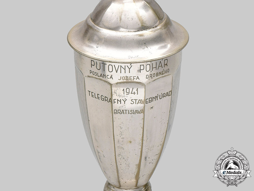 Constructed of nickel silver, consisting of a large stylized goblet with a laurel leaf stem completing in a paneled cup, the exterior bearing an engraved dedication of “PUTOVNÝ POHÁR, POSLANCA JOŽEFA DROBNÉHO, TELEGRAFNÝ STAVEBNÝ ÚRAD BRATISLAVA” (TRAVELLING CUP, TO MEMBER JOŽEF DROBNÝ, TELEGRAPH BUILDING OFFICE BRATISLAVA”), accompanied by its original custom-fitted lid with a circular laurel wreath handle, the base maker marked with the logo of Sandrik and a mark indicating nickel silver (Alpacca) composition, measuring 105 mm (w) x 278 mm (h), with minor tarnishing and scratching evident, in near extremely fine condition.