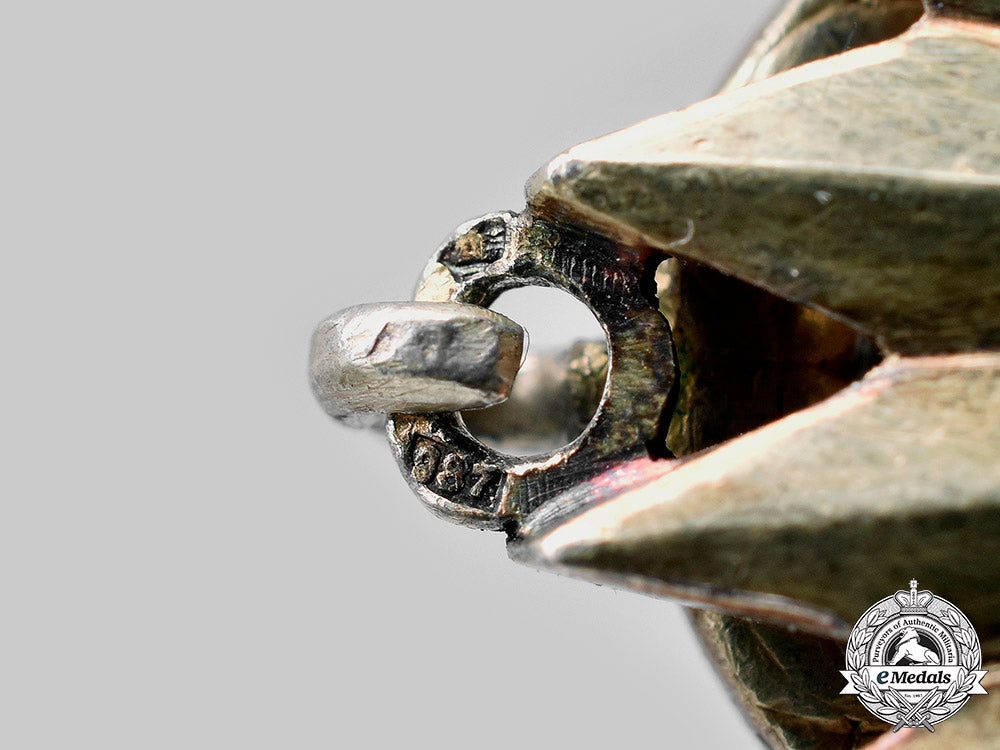 (Rad Kniežat'a Pribinu). Instituted April 8, 1940. Military Division. A III Class decoration composed of silver gilt, the obverse presents a star shape with clusters of four short smooth rays, between each cluster presents three blue enamel hills of Slovakia representing Tatra, Matra and Fatra with a double Christian cross above the hills, the obverse medallion presents a left facing portrait of Prince Pribina, surrounded by a ring of rays and a thing blue enamel ring, the reverse medallion presents a building with emanating rays in silver gilt surrounded by the inscription SAECULO NONO INTANTE FUNDAVIT (A generation is not founded instantly”), the badge is suspended from a wreath with crossed swords, maker marked on integral loop presenting a “K” denoting manufacture at the national mint a Kremnica, marked “987”, measures 54.65mm (w) x 77.80mm (h – inclusive of sword suspension), weighs 50.1 grams (including ribbon), worn on a full length neck ribbon, enamels intact, evident wear, in extremely fine condition.