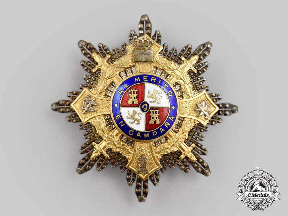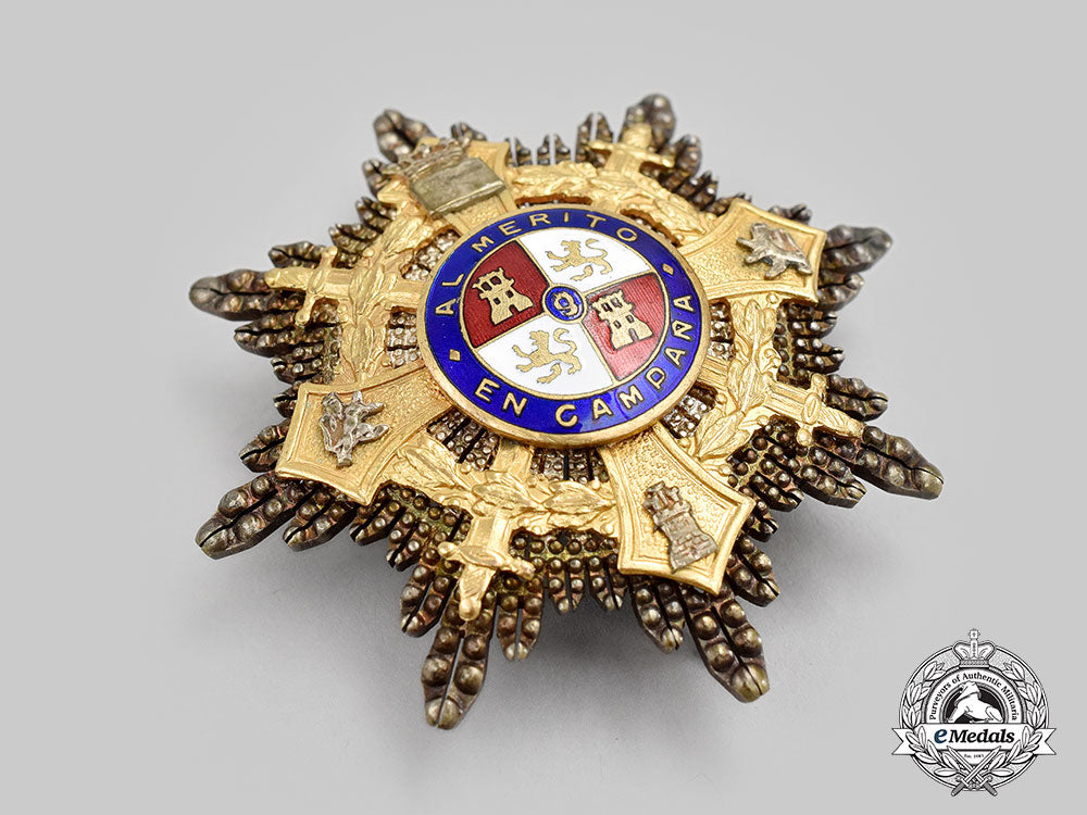 (Cruz de Guerra). Instituted in 1938. Type I (1938-1942). Centrepiece insignia in bronze gilt with red, white and blue enamels, the insignia centering a silver gilt wreath with cross and backed by crossed swords, the four arms of the cross bearing the Franco crown, two facing lions and a castle, mounted to a silver eight-pointed star base, each star point with five pairs of faceted rays, unmarked, measuring 62.8 mm (w) x 62.8 mm (h), vertical pinback flanked by dual stays, intact enamels, very light contact, near extremely fine.