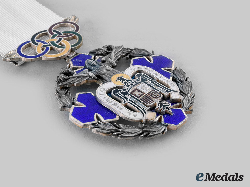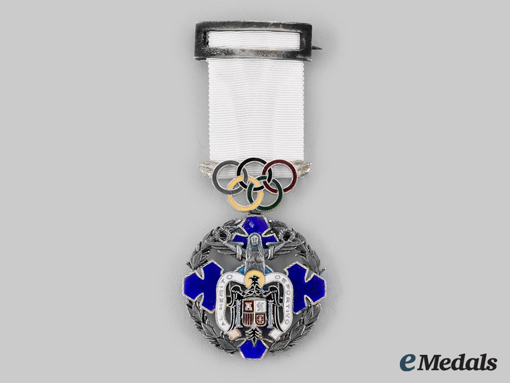 (Medalla al mérito deportivo). Instituted in 1952. Two-piece construction, in silver with red, white, light blue, dark blue, yellow, gray and black enamels, measuring 45.5 mm (w) x 64.3 mm (h) inclusive of its Olympic rings suspension, intact enamels, the two pieces held firmly in place via two pins, original ribbon, on a traditional Spanish-style horizontal hanger with pinback, extremely fine.