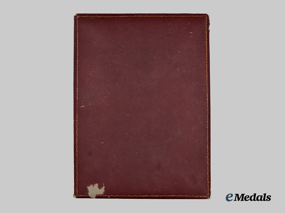 4. Accompanied by a presentation case, constructed of a lightweight wood core and a textured burgundy faux leather exterior, the interior of the lid is lined with off-white silk, marked “Villanueva y Laiseca Joyeros Madrid” in golden lettering, with the exterior metal hinge fully functional and the interior hinge cover fully intact, with a removable recessed medal bed for seating of the awards, measuring 185 mm (w) x 255 mm (l) x 80 mm (h), in better than very fine condition.