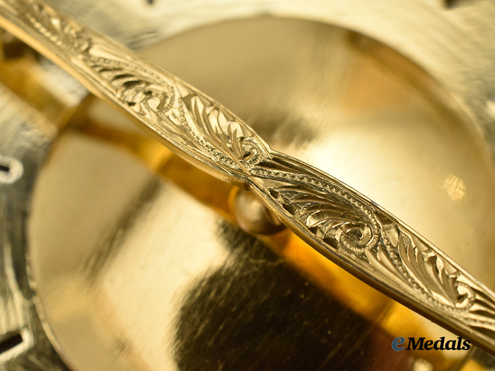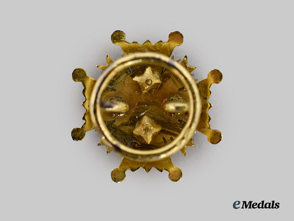 3. A boutonniere miniature of the award, in the shape of the breast star, silver hallmarked and marked “23M” on the ring on the reverse, measuring 21.6 mm (w) x 21.7 mm (l), weighing 4.39 grams, in extremely fine condition.