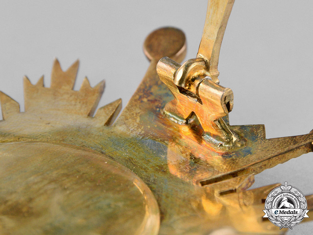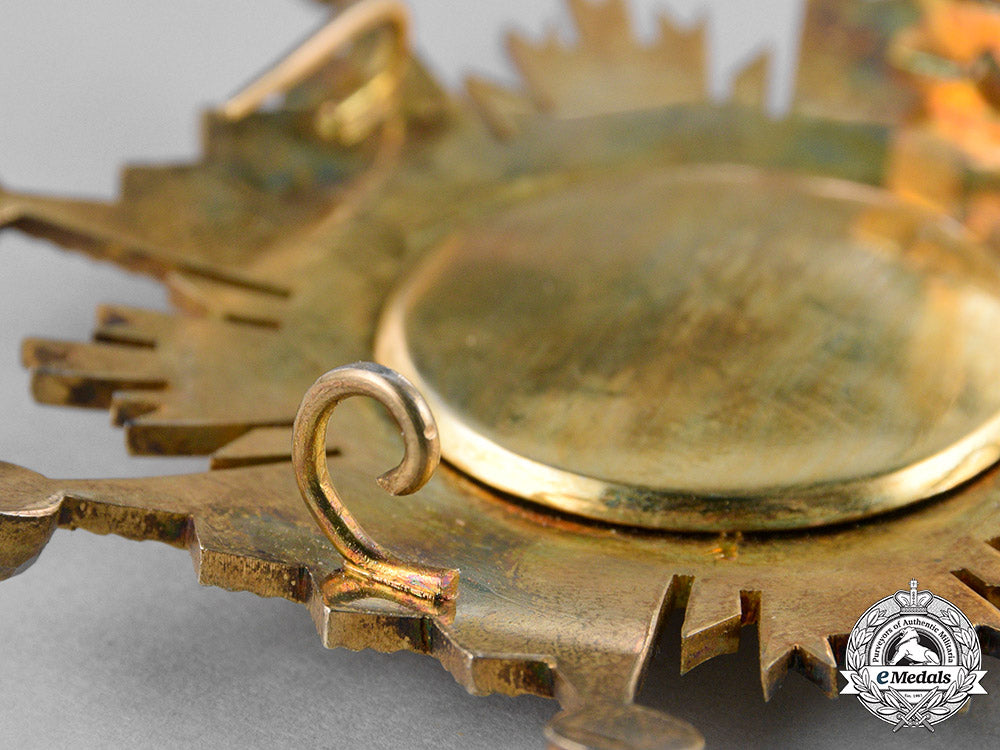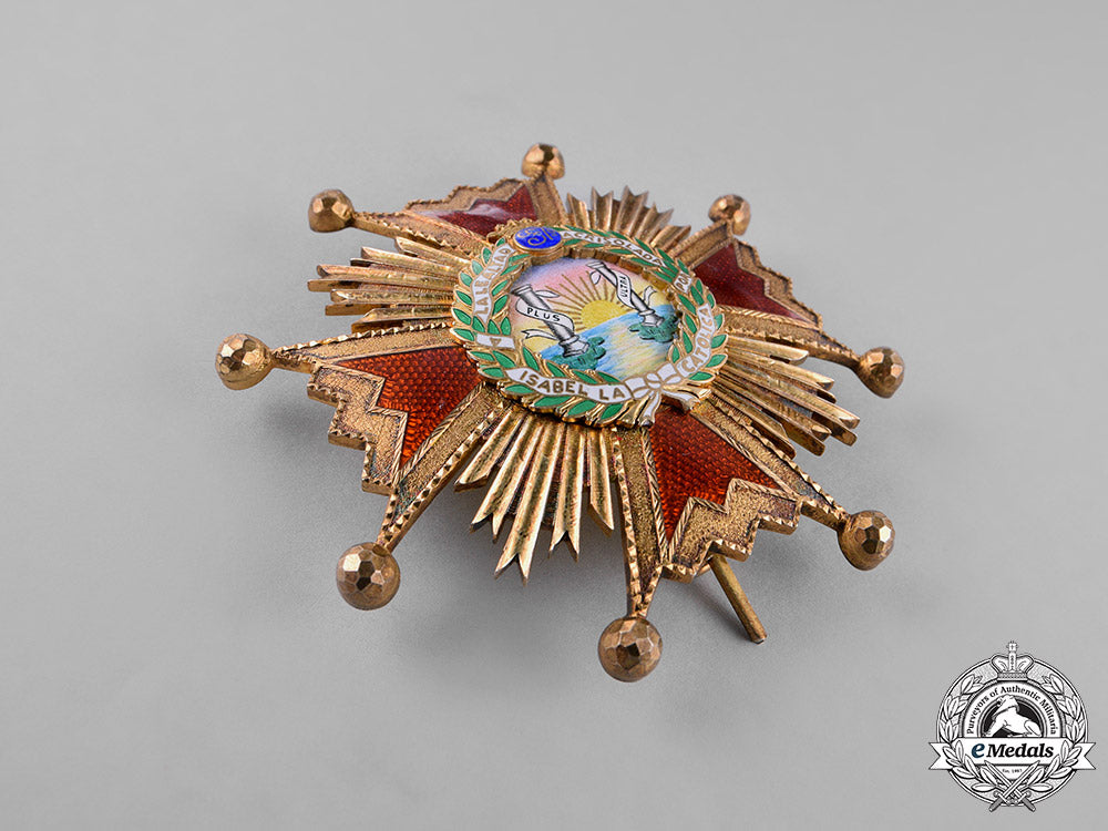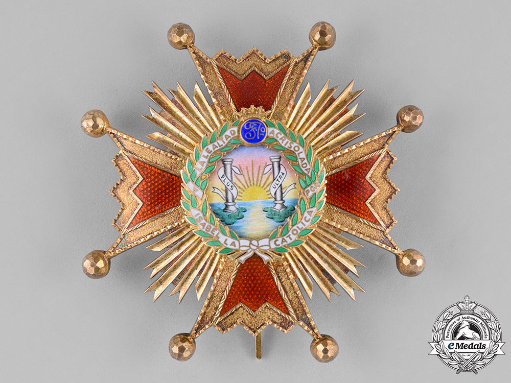 (Orden de Isabel la Católica). Instituted 1815. 1939-1975 issued. A silver gilt ball-tipped Maltese cross with red enamels, featuring cleft rays also in silver gilt in each quadrant, centre presenting a handmade insignia surrounded by a silver gilt enameled green laurel wreath, displaying the inscription A LA LEALTAD ACRISOLADA ISABEL LA CATOLICA, surmounted by typical of time period Spanish crown and cyphre of Ferdinand VII both in silver gilt, reverse with decorative pin assembly and dual stays, measuring 80.89 mm (w) x 80.96 mm (h), with minor toned silver gilt, extremely fine.