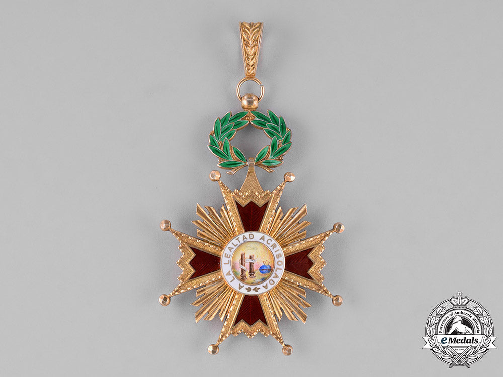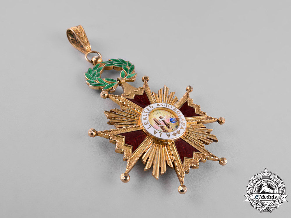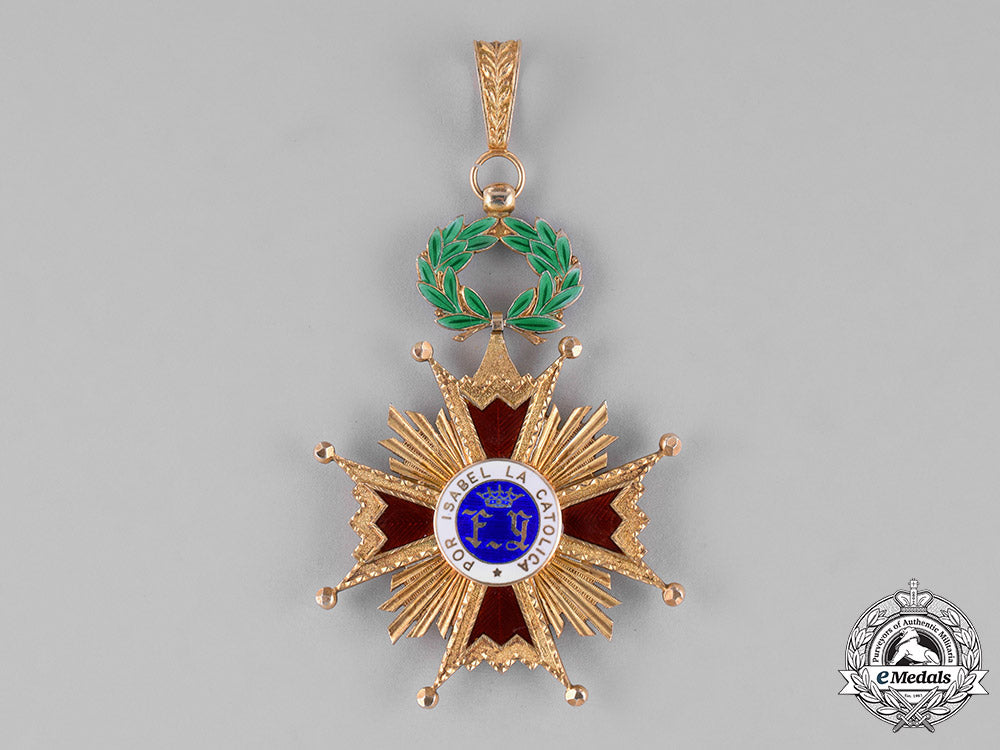 (Orden de Isabel la Católica). Instituted 1815. 1939-1975 issued. A ball-tipped enameled red Maltese cross in silver gilt, featuring cleft silver gilded rays in each quadrant, centre presenting a detailed handmade insignia surrounded by the inscription A LA LEALTAD ACRISOLADA in silver gilt, with blue and white enameled reverse centre displaying the cyphers of Isabella I and Ferdinand II, surrounded by the inscription POR ISABEL LA CATOLICA in silver gilt, suspended by a fine enameled green laurel wreath also in silver gilt, measuring 56.58 mm (w) x 81.15 mm (h - inclusive of laurel wreath and integral ring), accompanied by original silk ribbon, mint.