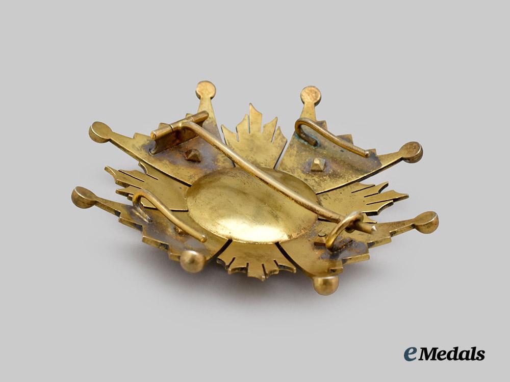 (Orden de Isabel la Católica). Instituted March 24, 1815. A lovely star in silver gilt, presenting a four point cross of red enamelled arms with large ball finials, between each arm sits a cluster of seven smooth rays, the obverse medallion features the blue enamelled monogram FR7, surrounded by a green enamelled wreath with a white enamel banner inscribed A LA LEALTAD ACRISOLADA POR ISABEL LA CATOLICA with a surmounting crown featuring the insignia on a blue enamelled field, the reverse presents a vertical pin assembly with dual stays, measures 72.4 mm (w) x 72.8 mm (h), enamel damage and replacements in arm, remains in very fine condition.