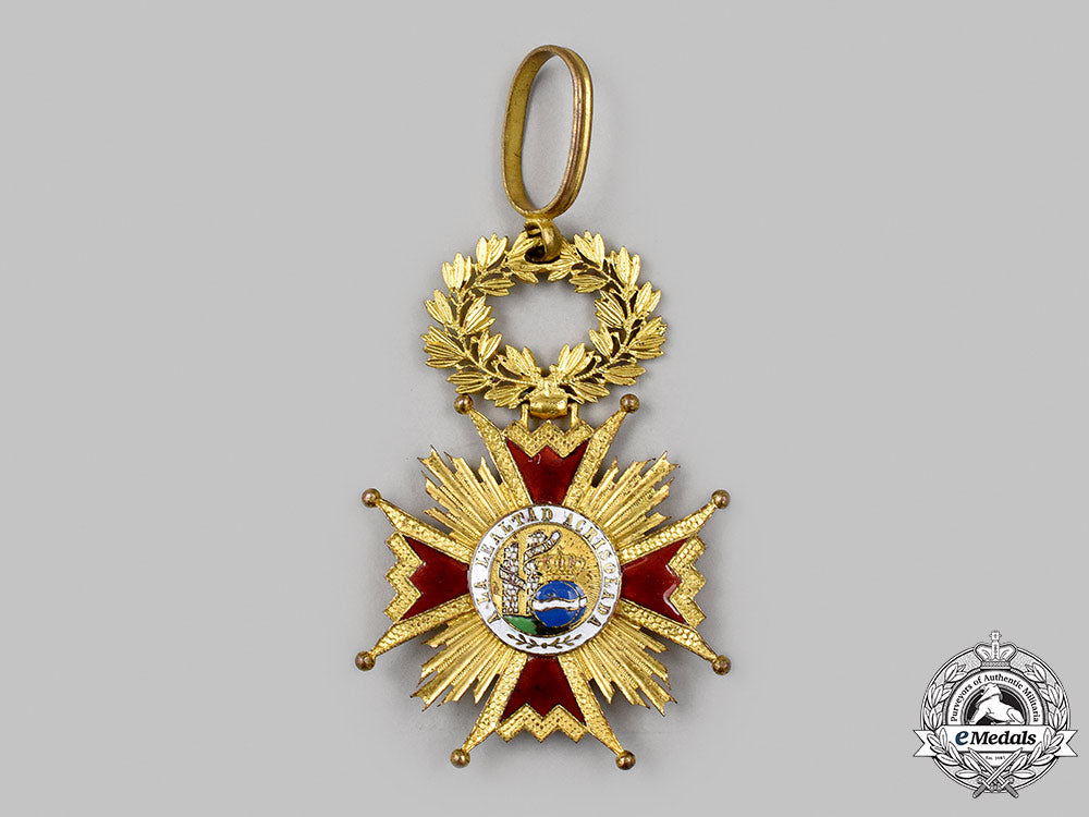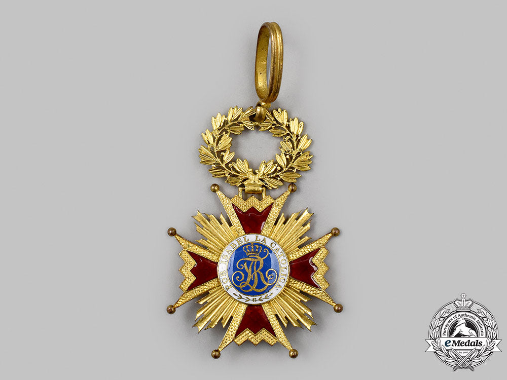 (Orden de Isabel la Católica). Three-piece construction, in bronze gilt with red, white, green and blue enamels, unmarked, measuring 50.3 mm (w) x 72.5 mm (h) inclusive of its wreath suspension, scattered gilt wear, chipping evident in the blue enamels on the obverse centrepiece, better than very fine.