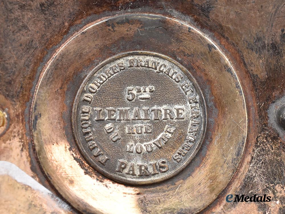 The Star, in silver gilt, presenting a four point cross of red enamelled arms with large ball finials, between each arm sits a cluster of seven smooth rays, the obverse medallion in Gold, features the hand-painted insignia of the order, surrounded by a green enamelled wreath with a white enamel banner inscribed A LA LEALTAD ACRISOLADA POR ISABEL LA CATOLICA (To Pure Loyalty, For Isabel the Catholic) with a surmounting crowned monogram of Ferdinand VII on a blue enamelled field, the reverse presents a vertical pin assembly with dual stays, the reverse cartouche presenting the maker mark of LEMAITRE, measures 76.6 mm (w) x 77.4 mm (h), enamel damage and replacements in arm, small areas of loss to medallion, remains in very fine condition.