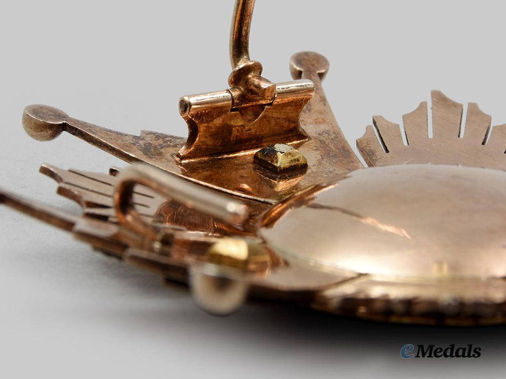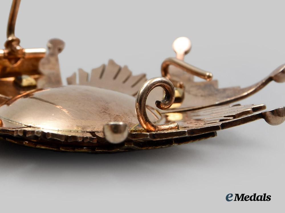 (Orden de Isabel la Catolica). Instituted March 24, 1815 by King Ferdinand VII. 1875-1931 Issue. In silver gilt, presenting a four point cross of red enamelled arms with large ball finials, between each arm sits a cluster of seven smooth rays, the obverse medallion features the hand-painted insignia of the order, surrounded by a green enamelled wreath with a white enamel banner inscribed A LA LEALTAD ACRISOLADA POR ISABEL LA CATOLICA (To Pure Loyalty, For Isabel the Catholic) with a surmounting crowned monogram of Ferdinand VII on a blue enamelled field, the reverse presents a vertical pin assembly with dual stays, pin is marked with numerous indecipherable, measures 77.70 mm (w) x 79.07mm (h), weighs 67.69 grams, large enamel flake to 3 o'clock arm, otherwise a beautiful decoration in near extremely fine condition.