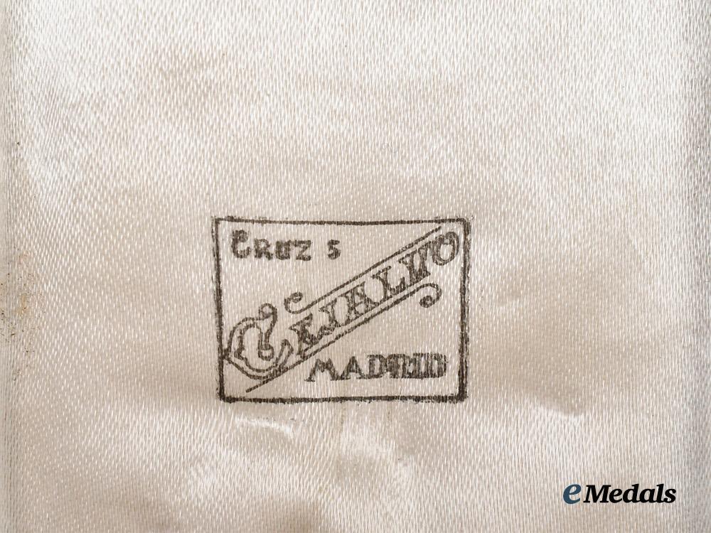 Contained in its hardshell case of issue, dark olive green exterior bearing the Spanish coat of arms, the interior with a partial velvet medalbed and silk lid marked CELIAVO Madrid, measures 90mm (w) x 154mm (h) x 35mm (d), clasp does not latch, medalbed loose/not adhered to the base, otherwise in near very fine condition.
