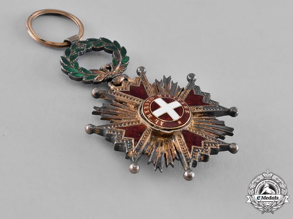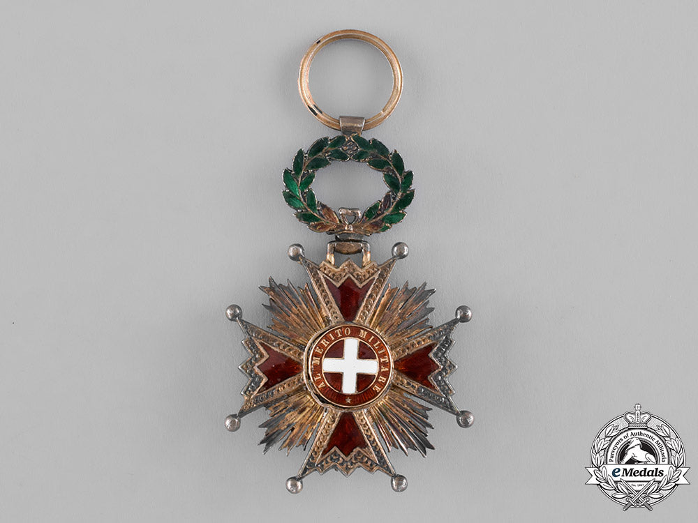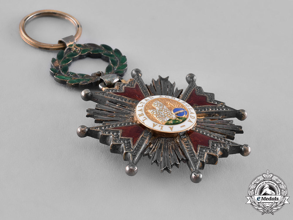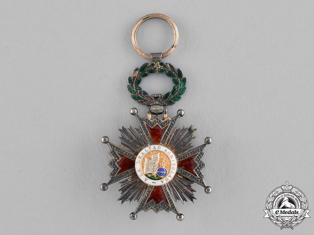 (Orden de Isabel la Católica). Instituted 1815. 1815-1847 issued. Likely of French manufacture, an unusual award consisting of a silver gilt Maltese cross with scaly arms and ball finials, red enameled arms, featuring clusters of five rays in each quadrant, obverse centre in Gold, depicting the inscription A LA LEALTAD ACRISOLADA (To Pure Loyalty) on an enameled white border, reverse having an early replacement reverse centre medallion depicting the coat of arms of Saboya I, which ruled Spain between 1871-1873, surrounded by the inscription AL MERITO MILITAR (To military Merit) in Gold, suspended by typical of time period enameled green laurel wreath in silver gilt, measuring 40.43 mm (w) x 61.10 mm (h - inclusive of laurel wreath and integral ring), with minor lost of red and green enamels, with lost of gilt and toned silver, accompanied by original ribbon, near very fine.