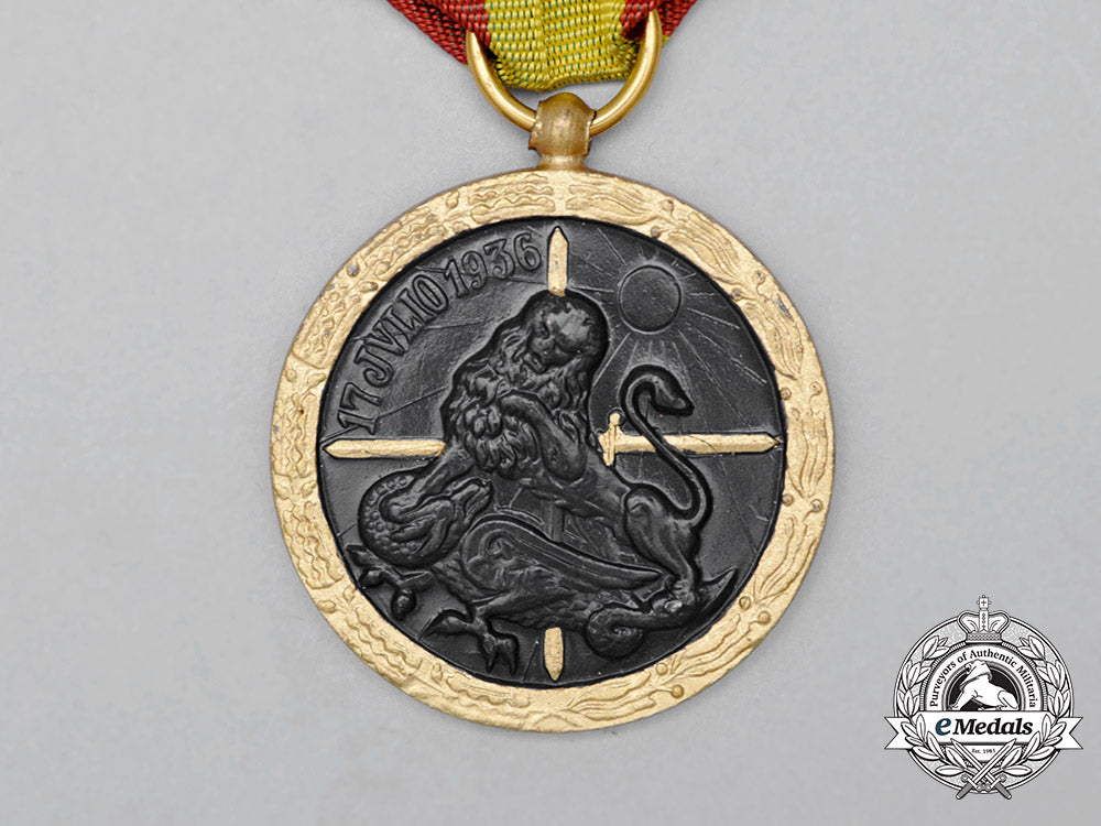 Footnote: The medal was established on January 26, 1937 and awarded to members of the Falangist forces fighting against the Republicans in the Spanish Civil War. The date on the medal of July 17, 1936 is that of the beginning of the armed rebellion against the Republican government. The rebels failed to take control of major cities, including Madrid and Barcelona, although the government could not successfully suppress the uprising. A long and bloody civil war followed and lasted until April 1, 1939. This led to atrocities on both sides and eventual victory for the conservative rebels.