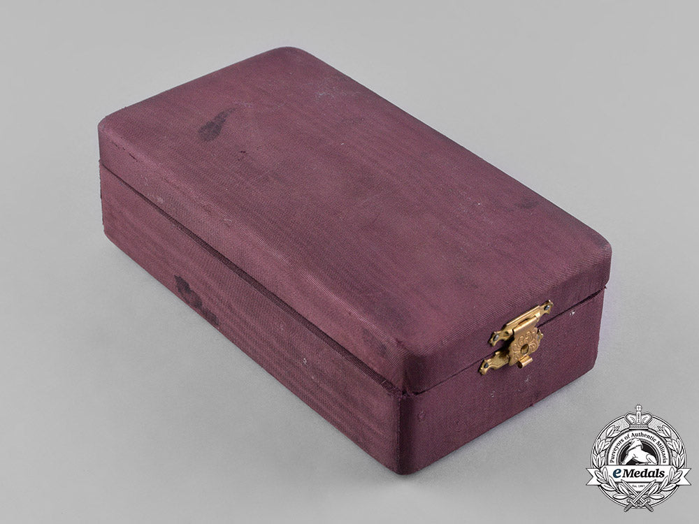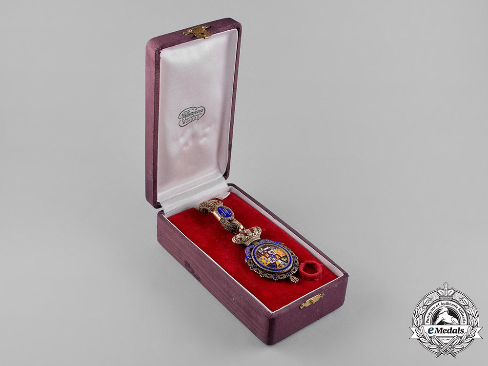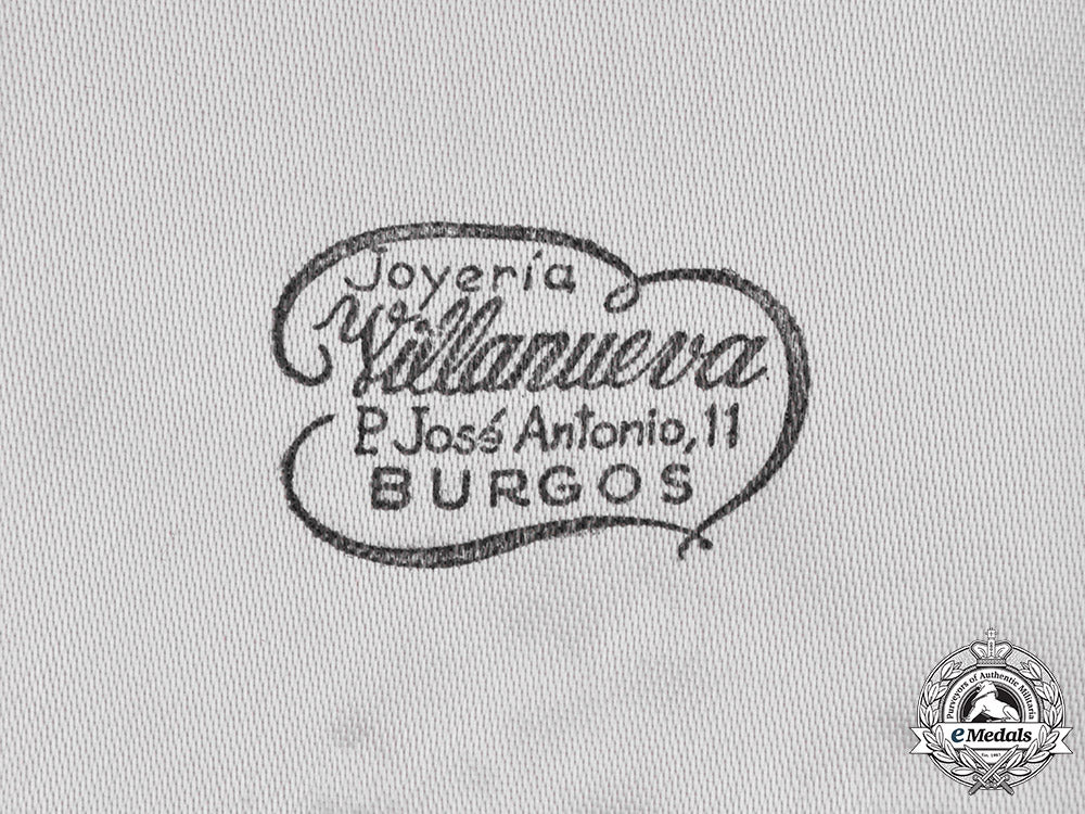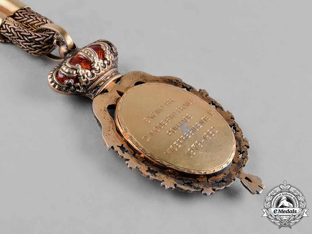 (Congreso de Diputados). Constructed of silver gilt, a Vice-president’s Badge consisting of an enameled central coat of arms of the Spanish Congress of Deputies in multiple coloring, surrounded by a blue and gilded border, as well as an outsider scale replica of the Collar of the Golden Fleece partially enameled, with a surmounted enameled blue lace inscribed CONGRESO DIPUTADOS (Congress of Deputies), the reverse engraved EXCMO. SR. D. MODESTO FRAILE POUJADE VICEPRESIDENTE 1o 1979-1982 (Excellency Don Modesto Fraile Poujade, first Vice-president 1979-1982), suspended by an enameled red period Spanish royal crown, measuring 40.25 mm (w) x 71.51 mm (h - inclusive of crown suspension), connected with a beautifully knitted gilt cordon to wear in neck, displaying a crowned cypher of Juan Carlos I on a silver gilt clasp, cordon measuring 690 mm in total length, light contact, extremely fine condition; in its hardshelled case of issue, with red wood medal bed, marked on the interior lid maker’s label of Villanueva, with funcional clasp, stained exterior, case very fine.