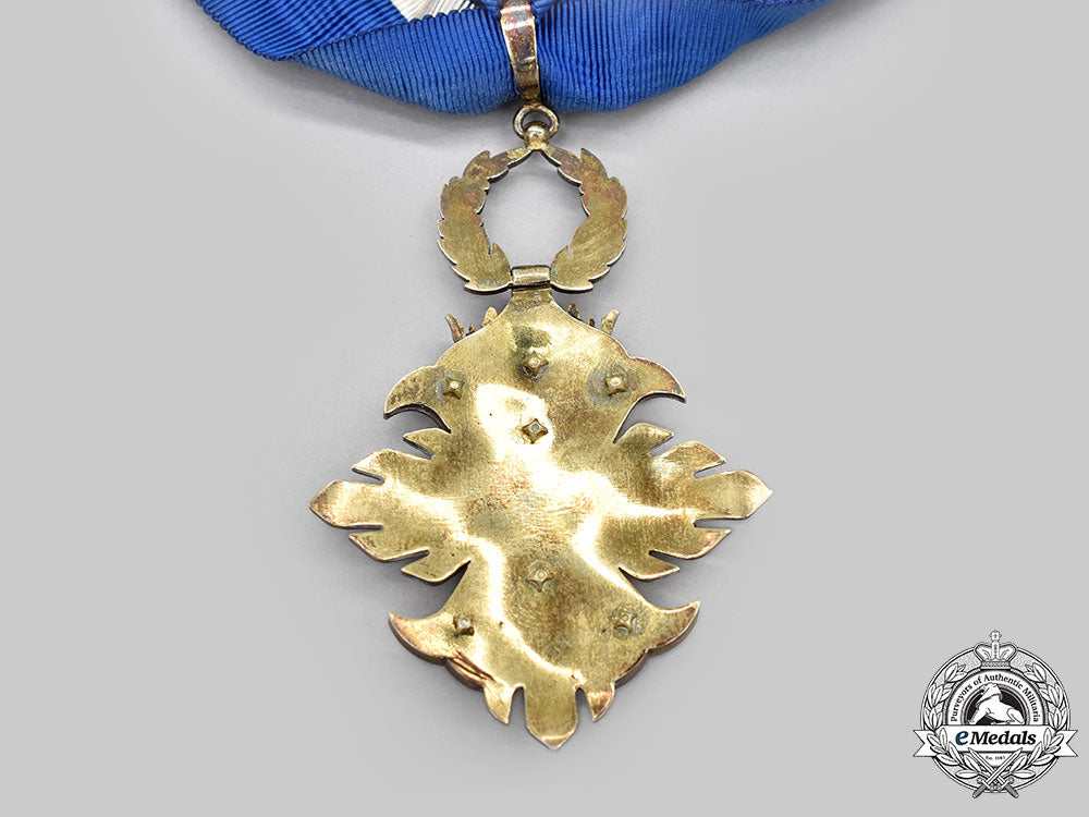 (Orden del Mérito Civil). Instituted in 1926. Type II (1942-1975). In silver with blue, white, red and green enamels, the Franco crown surmounting the insignia of the order, both of which are mounted to a cross base, with three faceted rays on the arms at 6 and 12 o'clock and five faceted rays on the arms at 3 and 9 o'clock, measuring 51 mm (w) x 76 mm (h) inclusive of its wreath and laterally-pierced ball suspension, chipping evident in the blue enamels on the oval centrepiece ring to the right of "CIVIL", otherwise the enamels are intact, on its original full-length neck ribbon, better than very fine.