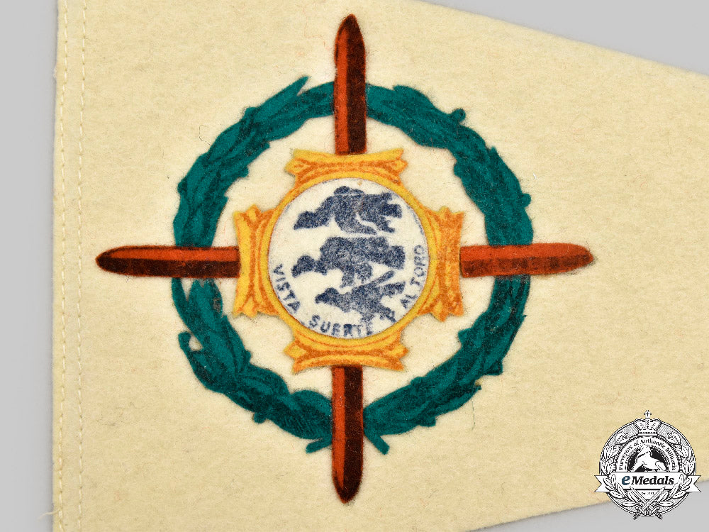 An extremely well-preserved Blue Squadron (Patrulla Azul) unit pennant, constructed of a white wool base, the obverse bearing an elaborated multi-piece insignia consisting of a central white wool disc, overlaid by a Blue Squadron insignia in the form of three diving eagles above an inscription of “VISTA, SUERTE Y AL TORO” (colloquially translating to “WATCH OUT, HAVE LUCK, AND GO FOR THE BULL”), on top of double-overlaid crosses, and within a green laurel leaf wreath, unmarked, measuring 290 mm (w) x 138 mm (h), the three corner bearing holes indicating previous pin attachment, in overall extremely fine condition.