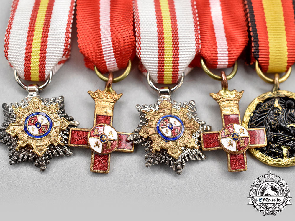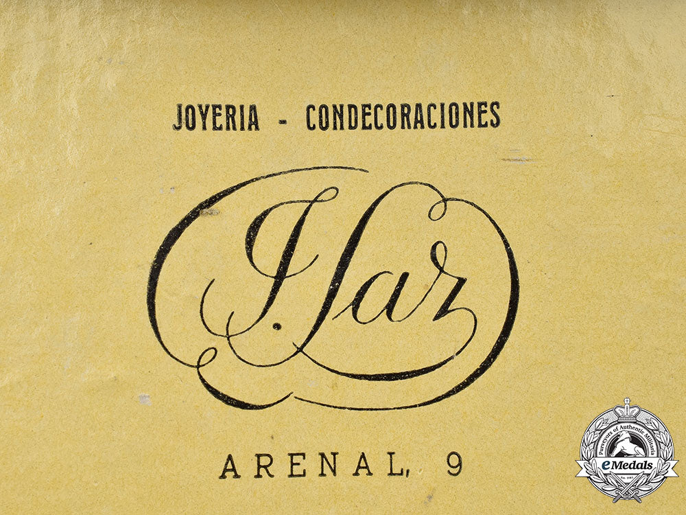 In their hardshelled presentation case, maroon pebbled paper exterior, jeweller marked "JOYERIA - CONDECORACIONES / J. SAR / ARENAL, 9" in black ink on the inside lid, medal bed in white satin and padded, measuring 132 mm (w) x 57 mm (h) x 24.5 mm (d), paper wear and soiling evident on the exterior lid, case near very fine.