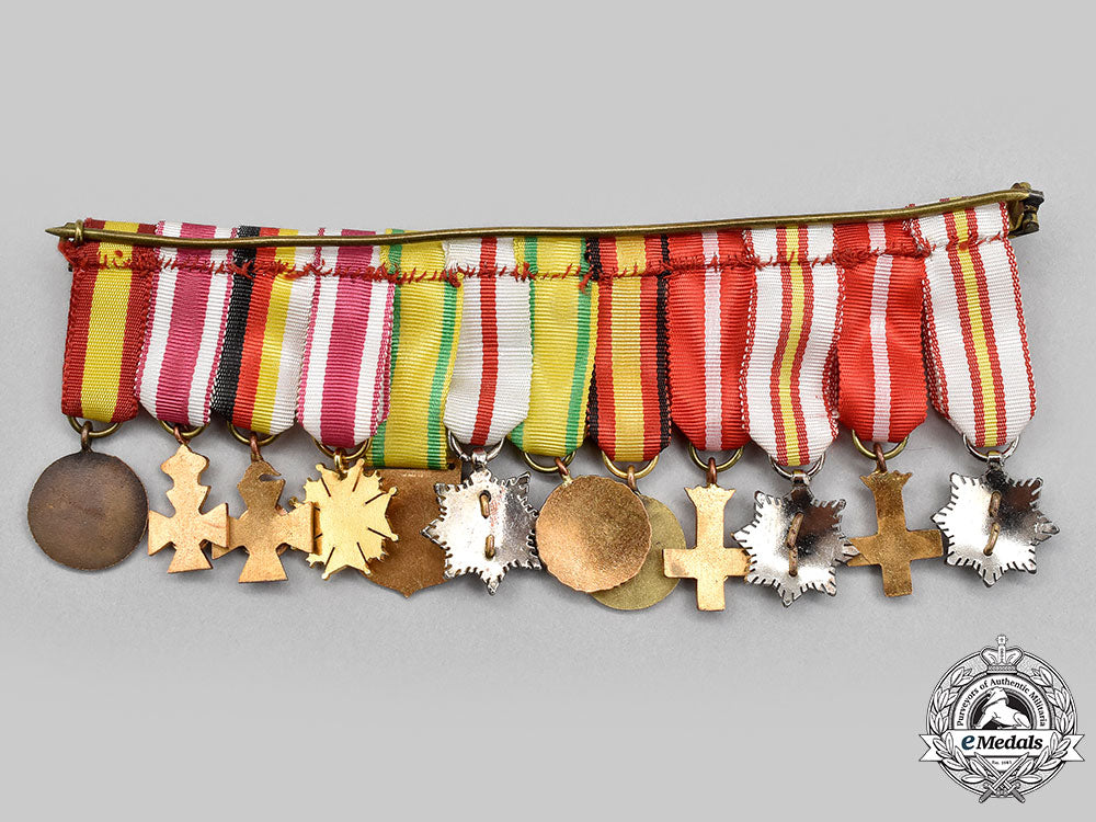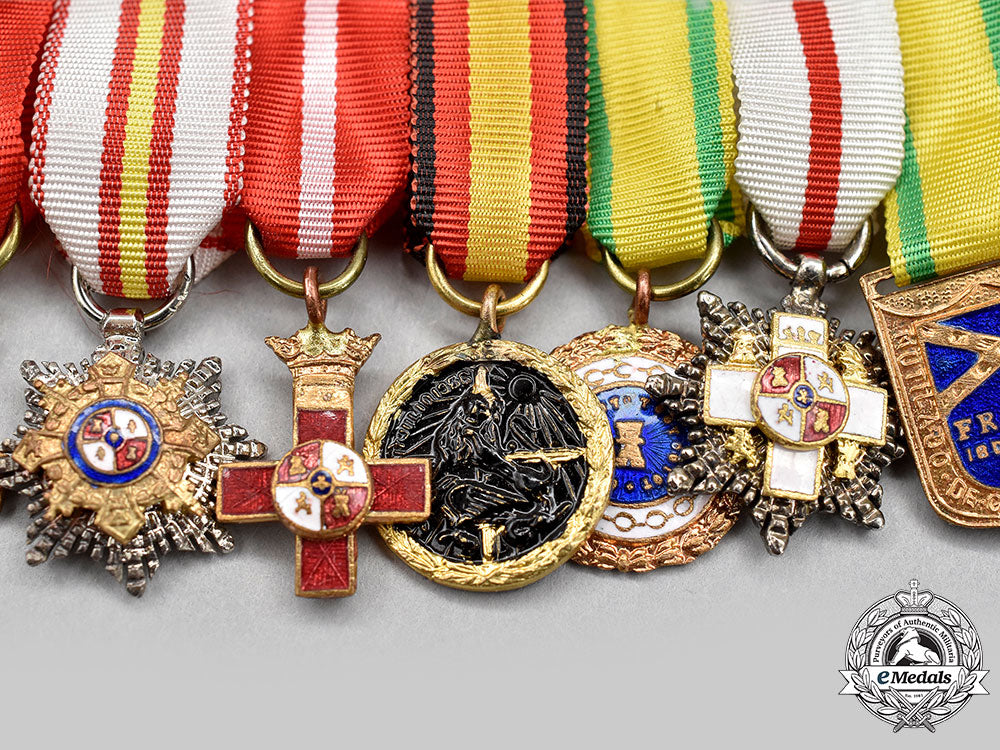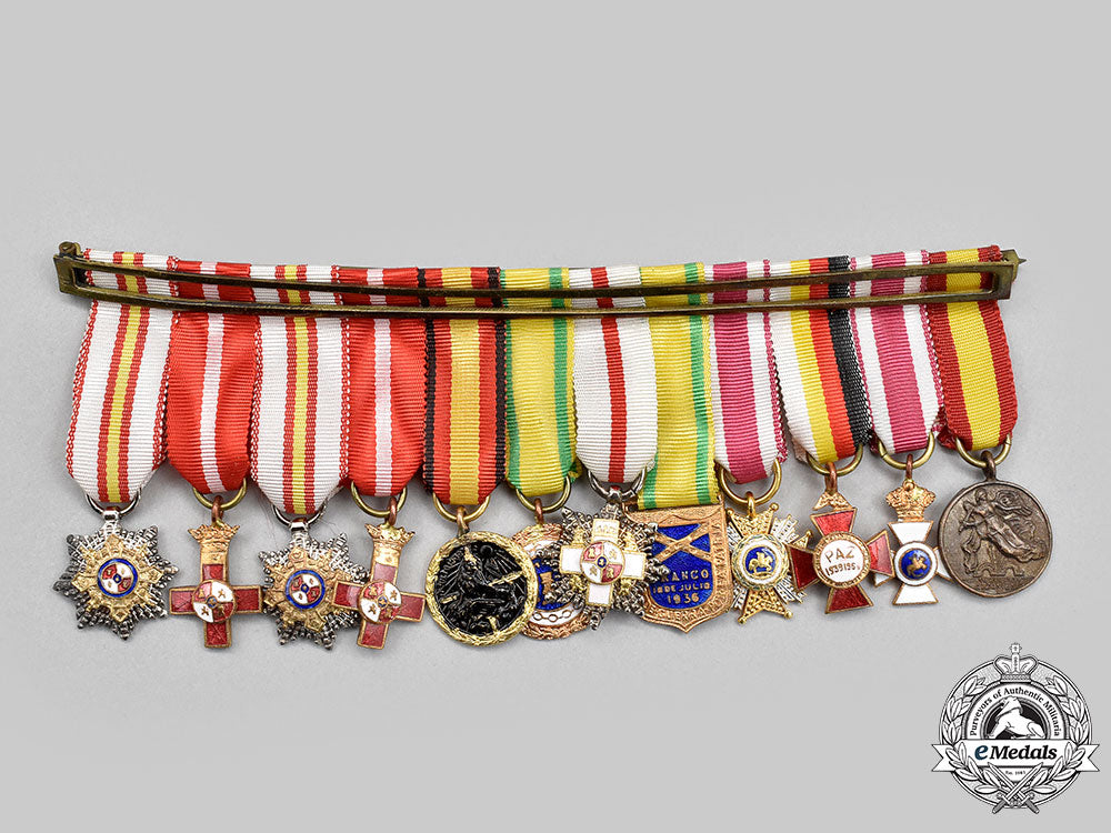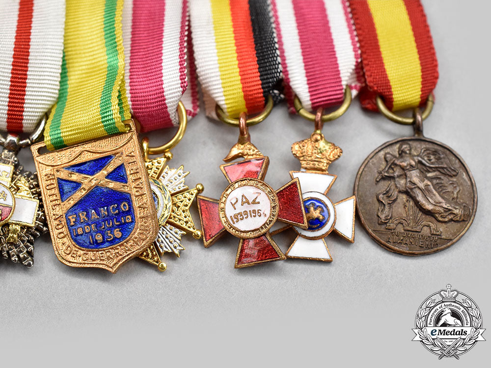 12. Spanish Civil War Victory Medal, "Alzamiento 1936": in bronze, measuring 15.5 mm in diameter. Mounted to a traditional horizontal hanger with swing bar pinback, original ribbons, intact enamels on all, extremely fine.