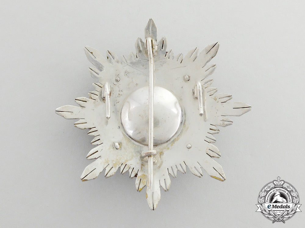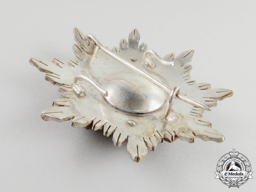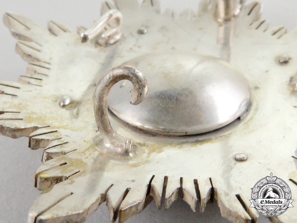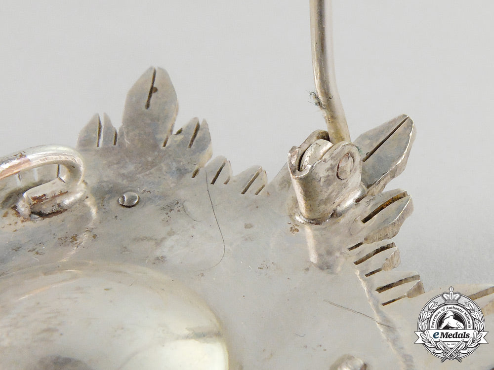 Spain; Franco Period; (1938-1975 Issue) In bronze gilt with red, white and blue enamelled insignias, mounted a silvered bronze eight-pointed star base, unmarked, 62.8 mm x 62.5 mm, vertical pinback flanked by dual prongs, intact enamels, extremely fine.
