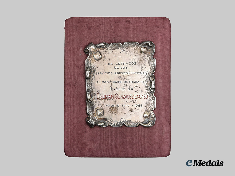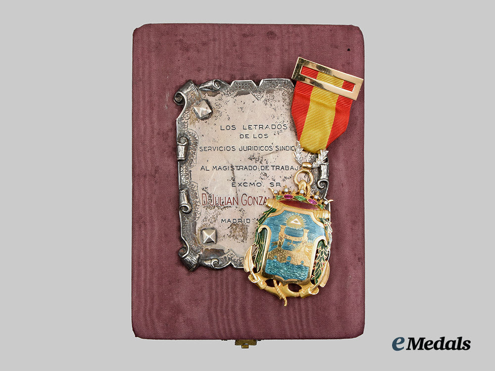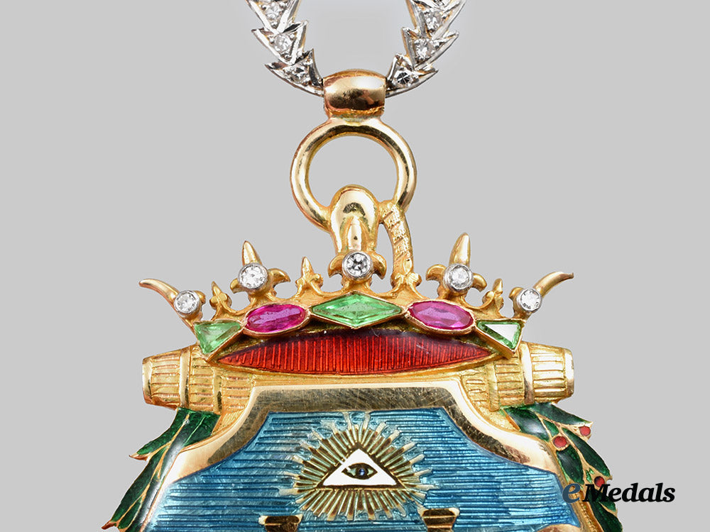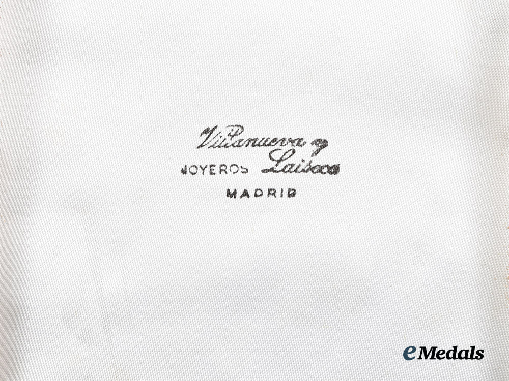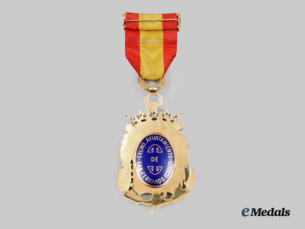 (Ayuntamiento de la Villa de San Fernando, Provincia de Cádiz). In 18K Gold with light blue, white, green, red and black enamels, with thirteen natural diamonds (five on the crown and eight on the wreath), the crown also housing two synthetic rubies and three synthetic emeralds, weighing 73.4 grams inclusive of its ribbon, obverse illustrating the coat-of-arms of the Town of San Fernando, Cadiz Province (the town located in the south of Spain) and surmounted by the Franco crown, reverse with an oval-shaped cartouche inscribed "EXCMO. AYUNTAMIENTO DE SAN FERNANDO (CADIZ)", measuring 44.7 mm (w) x 91 mm (h) inclusive of its open-ended wreath suspension, some of the black enamels on the "UNION Y FUERZA 1810 1820" (Union and Strength) lettering on the ribbon banner having worn away, otherwise the enamels are intact, original ribbon suspended from a traditional Spanish-style hanger with pinback, the hanger also in Gold, extremely fine.
