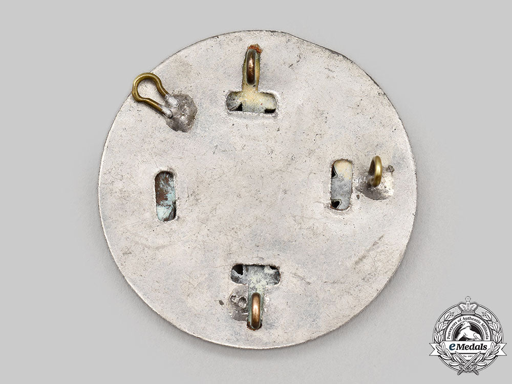 (Real y Militar Orden de San Fernando). Instituted in 1811. Insignia badge in silvered bronze with red and green enamels, measuring 41.3 mm (w) x 41.3 mm (h), mounted to a 45.5 mm in diameter magnetic plate via two of the four intact loops on the badge, an additional two loops soldered to the reverse of the plate, intact enamels and residue evident on the insignia badge from cleaning, near extremely fine.
