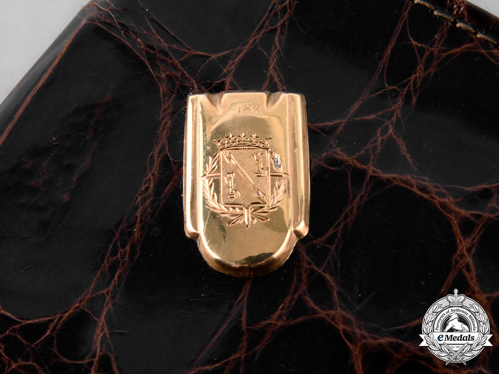 Exterior in chocolate brown leather, with a cracked-look design and lacquered, an 11.5 mm (w) x 18.7 mm (h) insignia in 18K Gold bearing the engraved Francisco Franco coat-of-arms and marked "18K" affixed at the upper left, inside lined in a dark brown rayon/silk, with three full-width slots with dividers placed across the centre spread, in staggered heights, all of which are open on the right side, designed for bills, papers and cards, two additional slots affixed to the lower part of the left panel designed for stamps and coins, the wallet measuring 100 mm (w) x 98 mm (h) when folded, very light wear evident in the fold area on the interior, extremely fine.