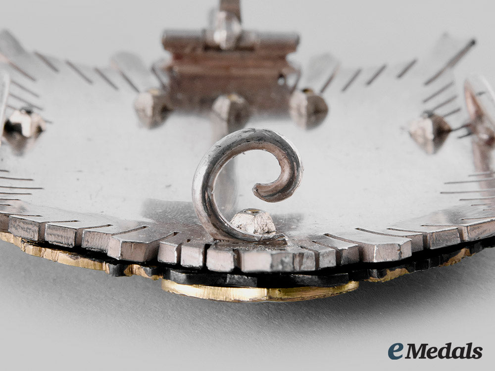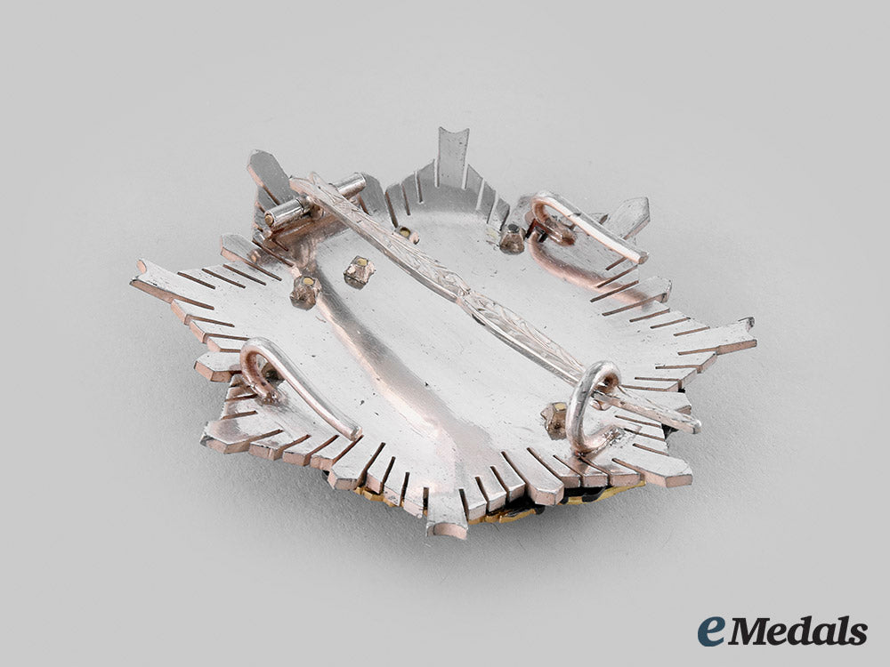 (Orden al Mérito Agrario). Instituted 1905 by King Alfonso XIII. 1939-1975 Issue. Consisting of an enameled green eight-pointed multi-rayed star in silver, the obverse features a woman plowing the field in silver with patination, encircled within an enameled white ring inscribed MERITO AGRICOLA (Agricultural Merit) in silver gilt, with an outsider ring depicting a necklace linked by Zodiac signs also in silver patina, the base with a period Spanish coat of arms in silver gilt and enamel, surmounted by a period imperial crown also in silver gilt, the reverse with typical Spanish centre pin and dual stays, measuring 70.10 (w) x 69.72 mm (h), presenting light contact, extremely fine.