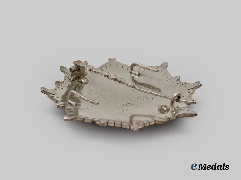 (Orden al Mérito Agrícola). Instituted December 1, 1905. In silver, a large eight point star with green enamelled rays, the obverse medallion featuring a female working in a field, encircled by a white enamel ring inscribed MERITO AGRICOLA, encircled by agricultural symbols and topped with a gilt crown, the reverse features a decorative pin flanked by dual stays, measures 77.7 mm (w) x 77.9 mm (h), weighs 92.2 grams, cracks in green enamel rays, functional pin and catch, remains in better than very fine condition.