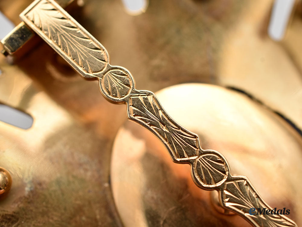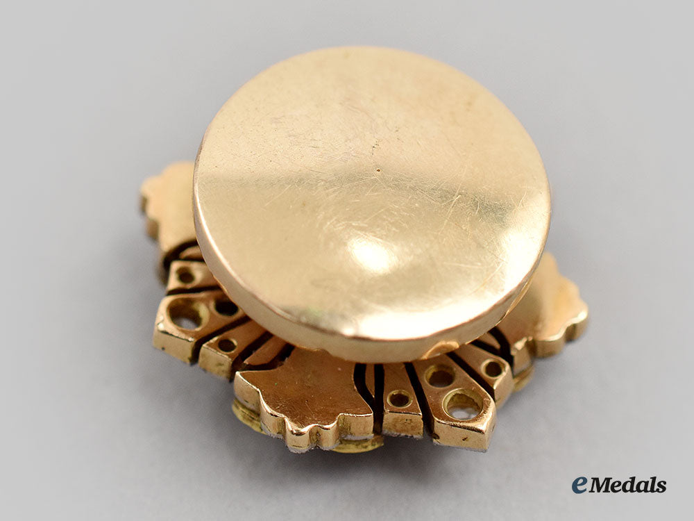 (Orden del Mérito Civil). Instituted in 1926. In 18K Gold, an eight point star with clusters of alternating smooth and faceted rays, a large blue enamel cross with white borders superimposed on the star, the center medallion features a female figure encircled by a blue ring inscribed AL MERITO CIVIL, the cross is surmounted by a crown set with genuine diamonds with green and red stones, the reverse features a detailed vertical pin flanked by dual stays, measures 76.8mm (w) x 79.8mm (w), weighs 62.1 grams, enamels intact, light wear, remains in extremely fine condition.