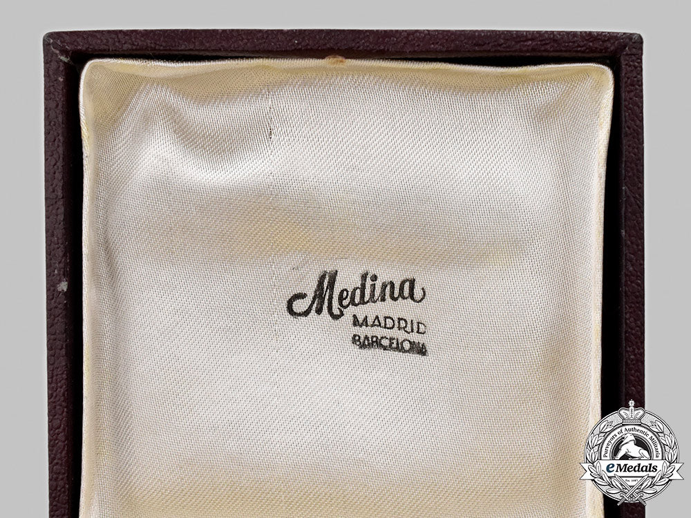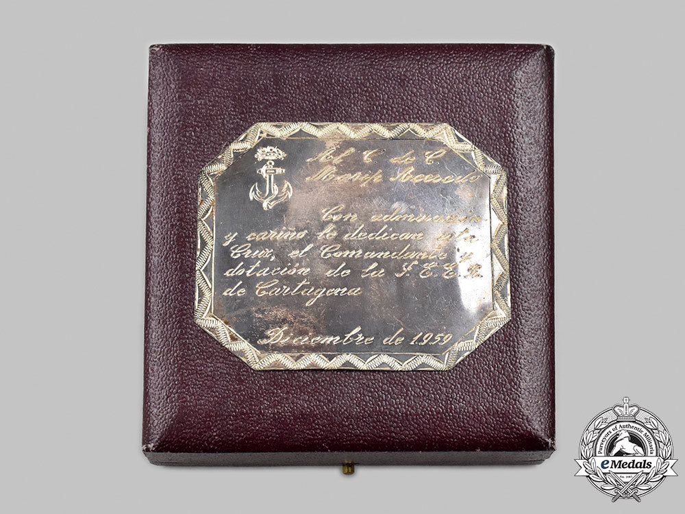 (Cruz del Mérito Naval). Instituted in 1866. Type VII (1942-1976). Fullsize: multi-piece construction, insignia in silver gilt with blue and white enamels, surrounded by four icons and surmounted by the Franco crown in silver gilt, the insignia mounted to an eight-pointed star base, each star point with five pairs of faceted rays, with a single pair of faceted rays between each point, measuring 62.8 mm (w) x 62.3 mm (h), vertical pinback flanked by dual stays; and Miniature: three-piece construction, two-piece insignia in silver gilt with blue and white enamels, mounted to an eight-pointed star base, each star point with five faceted rays, measuring 22.5 mm (w) x 22.5 mm (h), ring-style button hole attachment with safety pin. Both with intact enamels, extremely fine. In their hardshelled case of issue, pebbled maroon exterior, silver plate affixed to the lid engraved in running script "Al C. de C. Masip Acevedo / Con admiración y cariño de dedican esta Cruz, el Comandante y dotacion de la J.E.E.R. de Cartagena / Diciembre de 1959", inside lid in white satin and maker marked "Medina MADRID BARCELONA", slotted yellow felt medal bed, measuring 100.5 mm (w) x 100.5 mm (h) x 37.5 mm (d), light wear evident on the bottom, case also extremely fine.