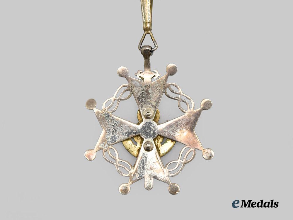(Orden de la Cruz de San Raimundo de Peñafort). Instituted in 1944. The Badge in silver gilt, with a Maltese cross in white enamel, interlinking ropes in each quadrant, the obverse centerpiece illustrating a standing Saint Raymond in blue, red, and white enamels, holding a book, a disk halo in yellow enamel around his head, wrapped around the bottom of the figure sits a blue-enameled banner with the words IN JURE MERITA, measuring 58 mm (h) x 50 mm (w). The badge is attached to a collar chain bearing twenty-four silver gilt icons, alternating between six Saint Raymond insignia, five JUSTITIA insignia, and ten rope insignia, the full-length of the chain measuring 48 mm. Very light contact, near extremely fine condition.