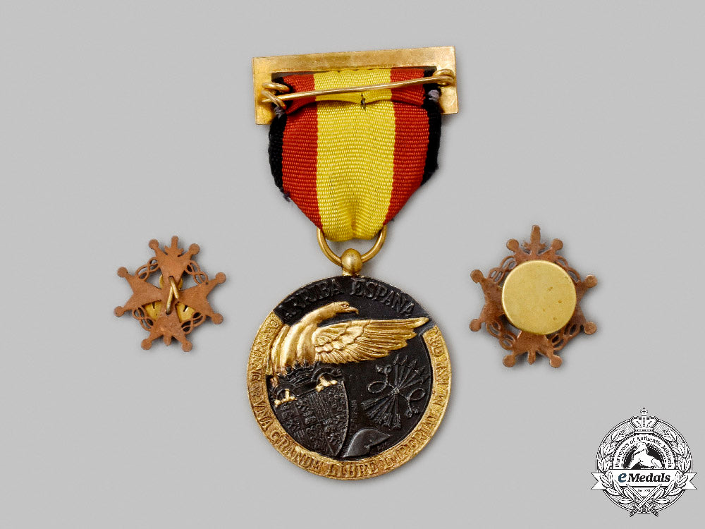 1. Spanish Civil War Medal for the Campaign of 1936-1939 (in blackened and gilt bronze, measuring 37 mm (w) x 42 mm (h) inclusive of its laterally-pierced ball suspension, original ribbon, on a traditional Spanish-style horizontal hanger with pinback);